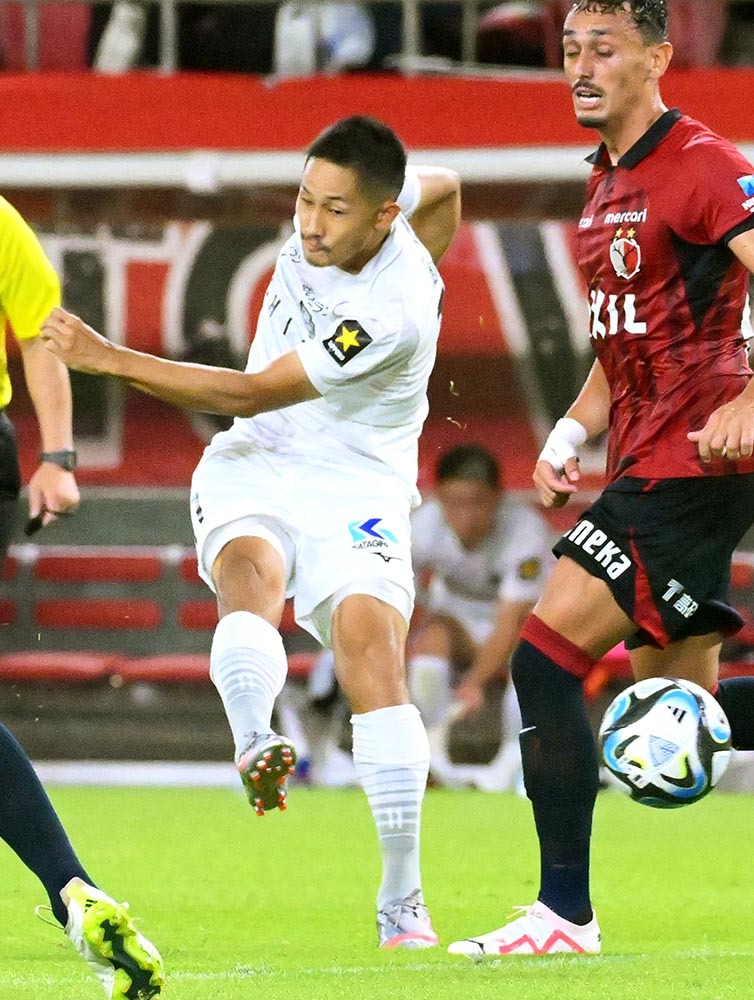 6日の鹿島戦、後半途中出場したMF青木がシュートを放つ