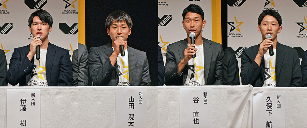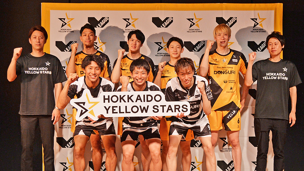 北海道イエロースターズが23日、札幌市内で「新体制発表大お披露目会」を行った。新監督に就任した浜崎勇矢氏(35)やアウトサイドヒッターの伊藤樹(25)、山田滉太(25)、ミドルブロッカーの谷直也(26)、セッターの久保下航平(25)の4選手が参加した。掲げたチームスローガンは「圧倒的チームワーク」。6月にチーム名を変更し、生まれ変わったイエスタが、悲願のV2優勝に向かっていく。
