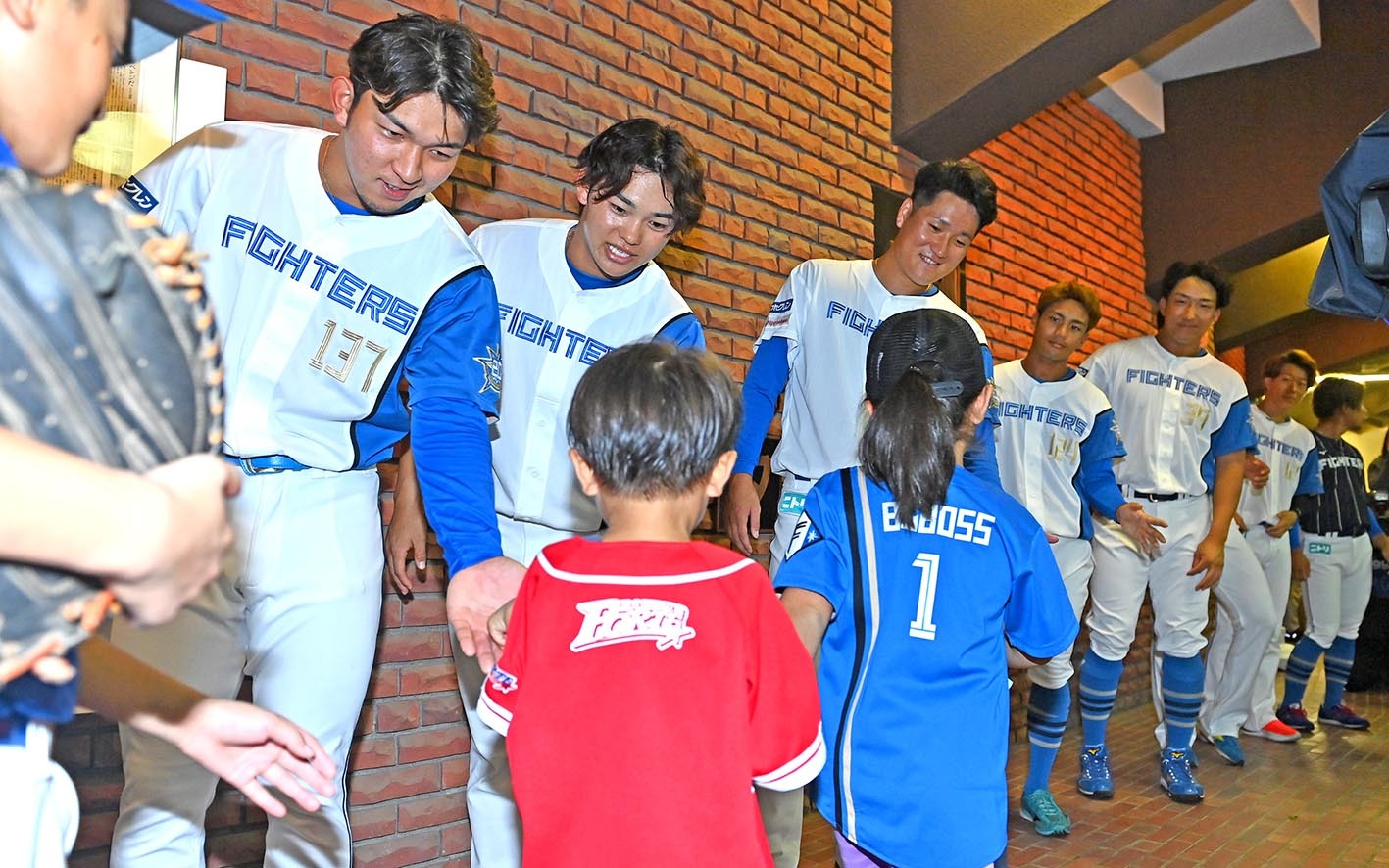 子どもたちと触れ合ったドラ1左腕は「前に釧路で野球教室をやった時に、すごく楽しいなと思いました。きょうは野球ができなくても、こうやって関わることができた。僕たちも楽しいし、すごく良い機会」と優しい笑顔を浮かべた。交流会後には、移動のバスの中から即席の〝サイン会〟を実施。わずかな時間も無駄にせず、ファンサービスに努めた。