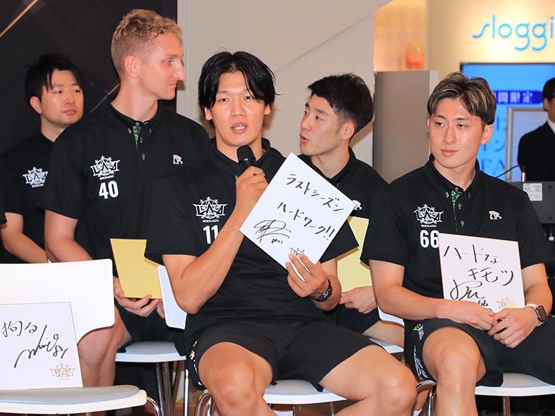 「桜井良太が今シーズンで引退する。クラブにとってもすごく大事なシーズンですし、個人的にも僕は桜井良太のためにチーム全体でハードワークをしていきたいと考えて選手たちに集まってもらっています。まだ合流していない2人の選手がいるんですけども、このメンバーでレバンガ北海道史上で、最もいい成績を僕たちは目指して頑張ってるので、今シーズンも会場で応援に来ていただけると嬉しい」