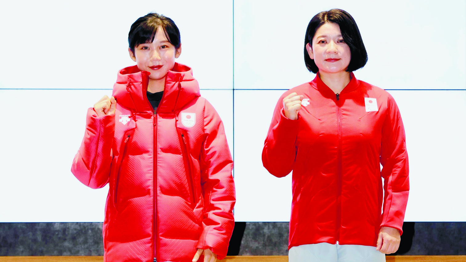 「TEAM JAPAN」の新エンブレムが施された公式ウエア。選手を代表し、ダウンジャケットに袖を通した高木美は「たくさんの方々の支えがあって、一つ一つがつくり上げられていると感じた。身が引き締まる」と気持ちを新たにした。