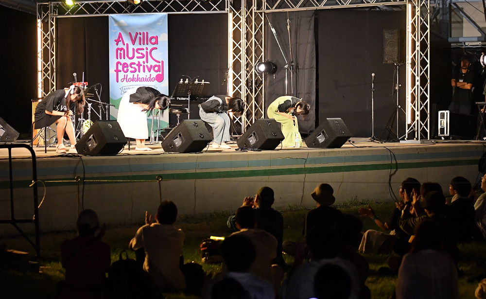 日が落ち、秋の訪れも感じさせた18時30分。再びタイトル未定がステージに上がり「mitei music」が始まった。普段とは打って変わって、4人が椅子に座りながらのアコースティックライブ。観客も芝生の上に座りながら、ペンライトをゆっくり振るなど、各々が4人の歌声に酔いしれた。「薄明光線」や「青春群像」、「栞」、「灯火」などの全12曲を披露。それぞれの歌唱力の高さを示し、いつもとは異なる一面を見せた。アンコールでは、通常ライブでの「鼓動」で観客と一体となり、「A Villa music festival HOKKAIDO 2023」は幕を閉じた。