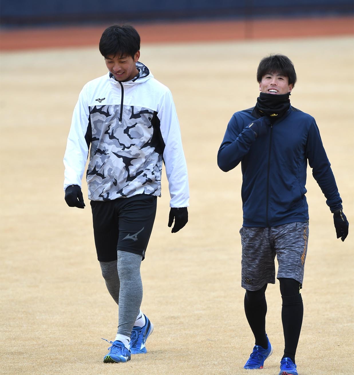 21年1月の新人合同自主トレで仲良く歩く古川(左)と五十幡