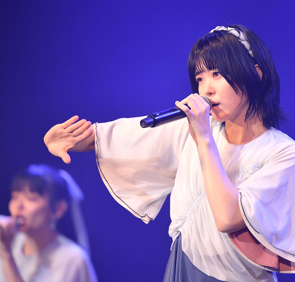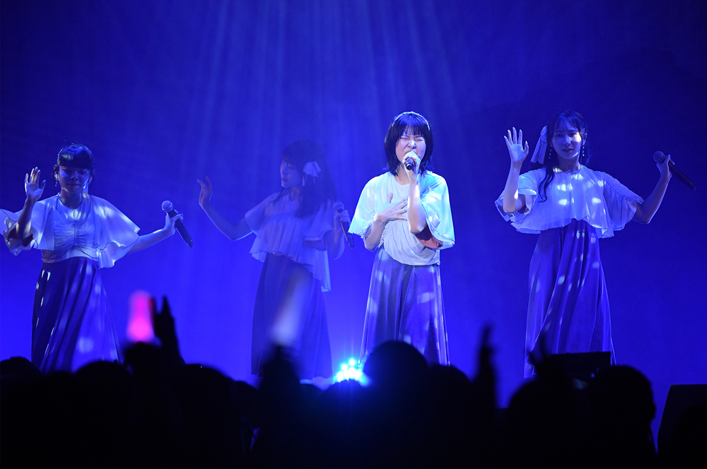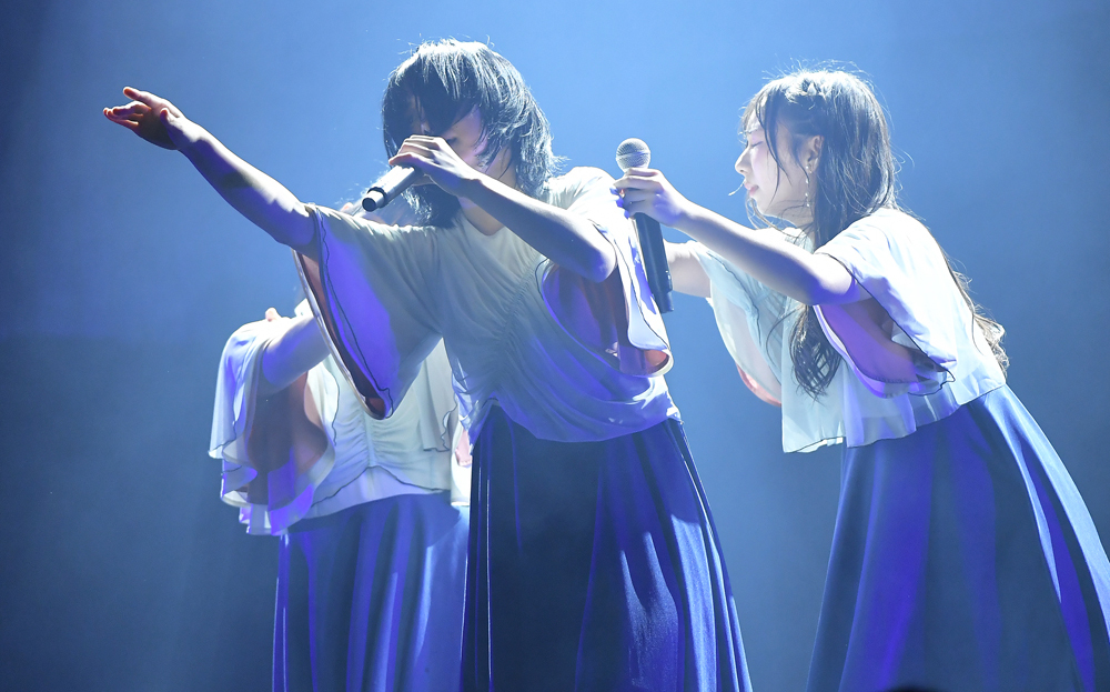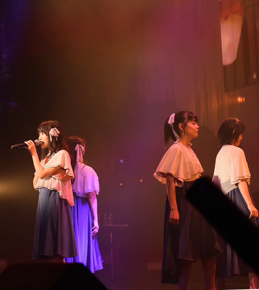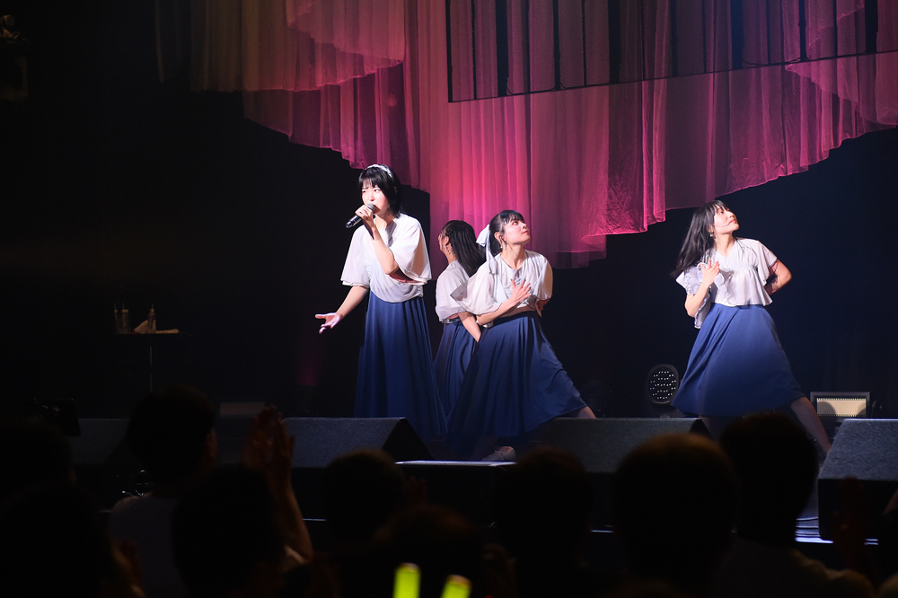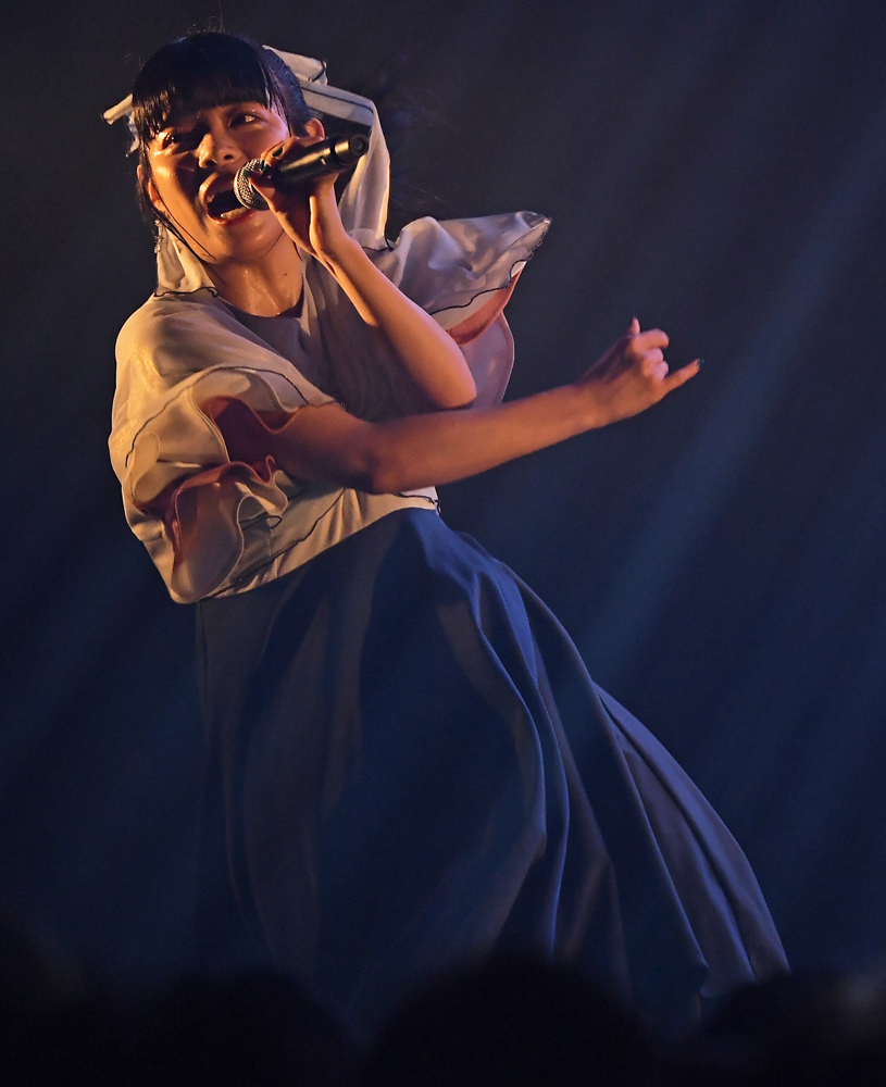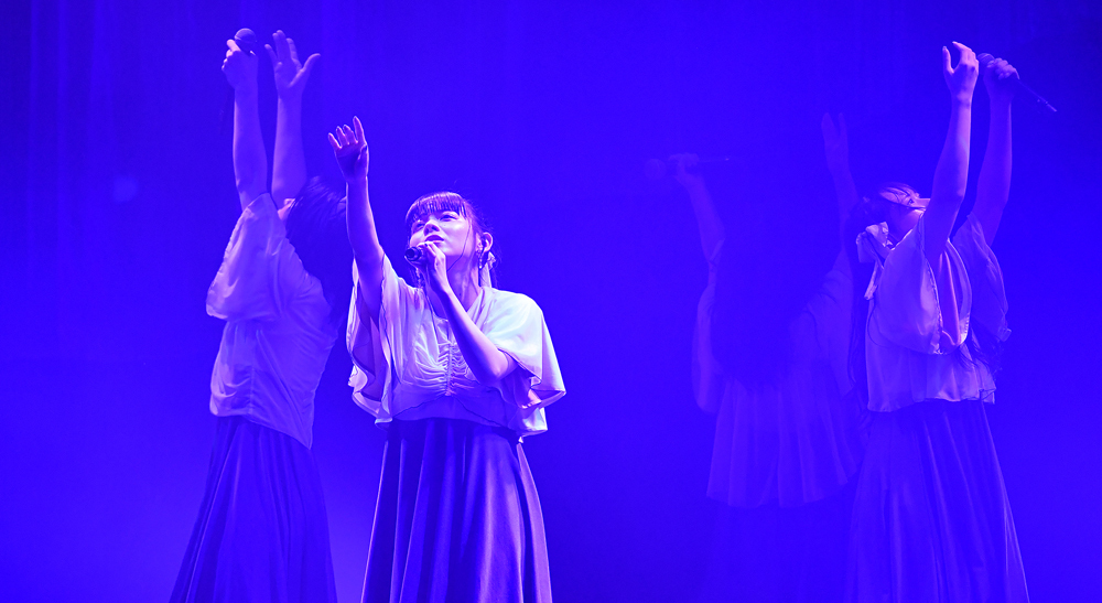 「夏が来れば」「夏のオレンジ」といった夏曲を披露すると、会場のテンションに火が付いた。アッパーチューンの「主題歌」が続いたと思えば、「溺れる」を力強く、かつ感情的に歌い上げて見事な緩急を演出した。そして、新曲「水流」を初披露。谷乃愛が「『薄明光線』と『溺れる』のアンサーソングになっていて、今、私たちがもがきながら進んでいる道の決断の意味を込めた曲になっています」と説明した。その後も「黎明」「花」と息をつかせる暇もなく、楽曲をたたみ掛けていくと、ファンのボルテージは一気に上昇した。