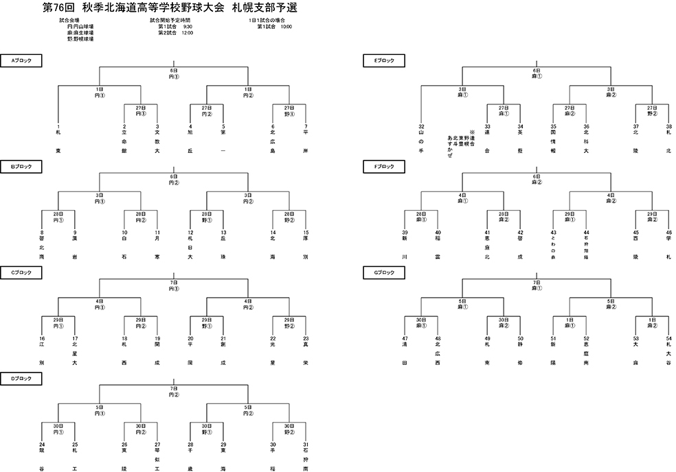 来春の選抜甲子園出場につながる秋季全道高校野球札幌支部の組み合わせ抽選会が9月12日、札幌市内で行われた。当初は10月7、8日に代表決定戦を予定していたが、10月8日開幕のかごしま国体に出場する北海に、日本高野連からベストメンバーで出場する旨の要請が来たことから、札幌支部の日程が1日繰り上がった。北海は6日に代表決定戦が行われるBブロックに入り28日の1回戦で札幌厚別との対戦する。