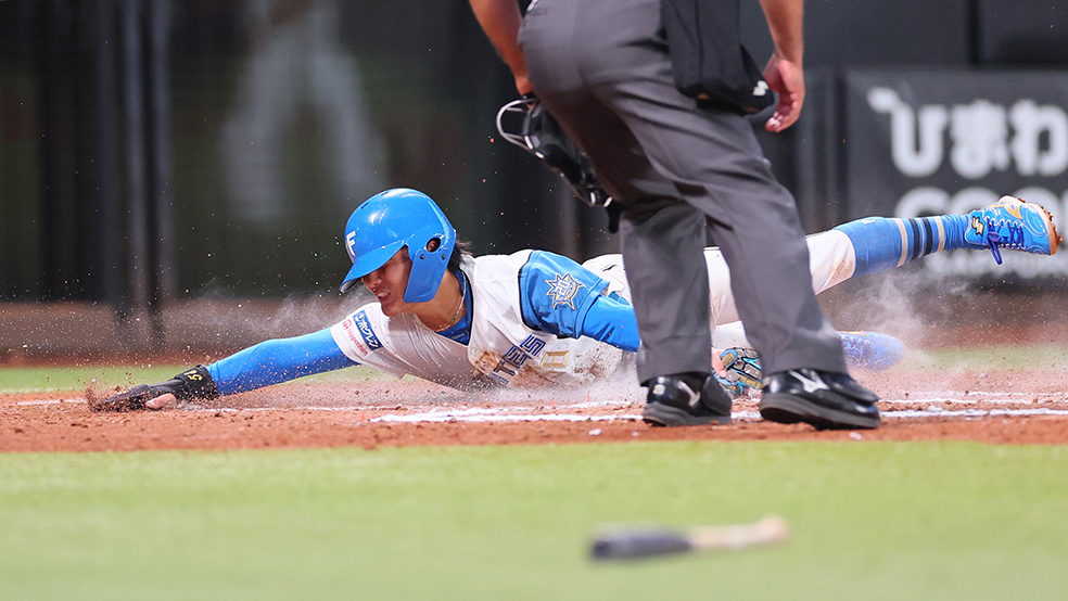 続く万波の打球は左翼手の頭上を越えた。奈良間は4点ビハインドも、迷わず、一塁から本塁に突入し、間一髪で生還した。「抜けた瞬間、ホームまで行かないといけない。思い通りの走路を走れたかな」。見せ場の少ない苦しい展開でも、ファイターズの新しい元気印が持ち前のガッツでファンを沸かせた。