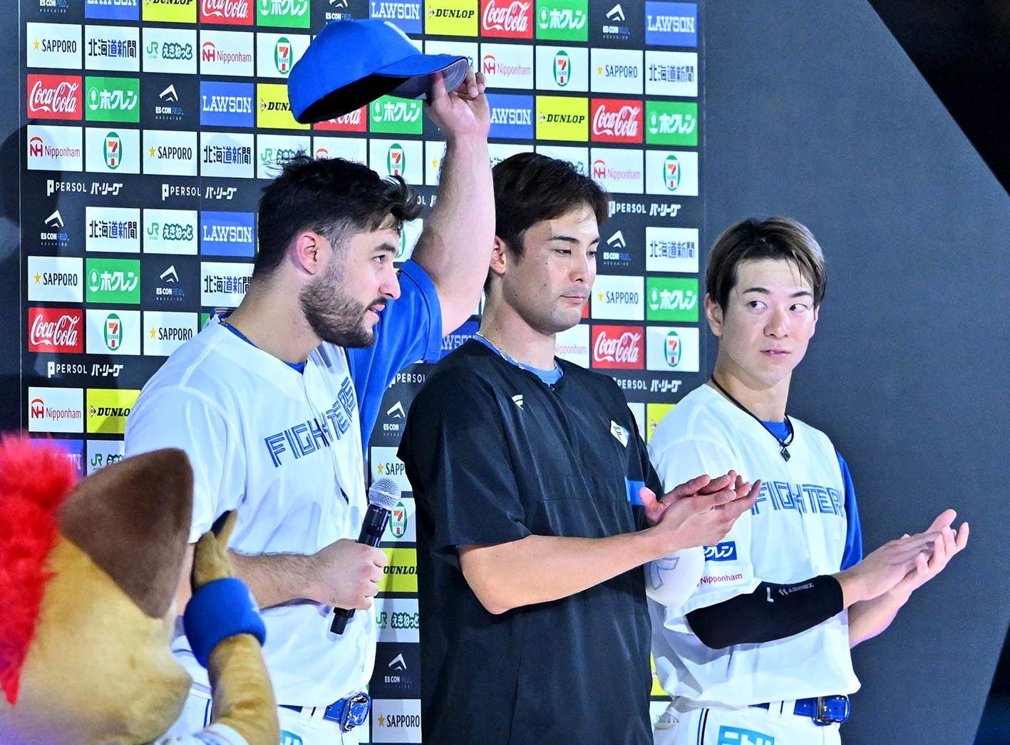 今季2度目のヒーローでお立ち台に立った上原(中央)