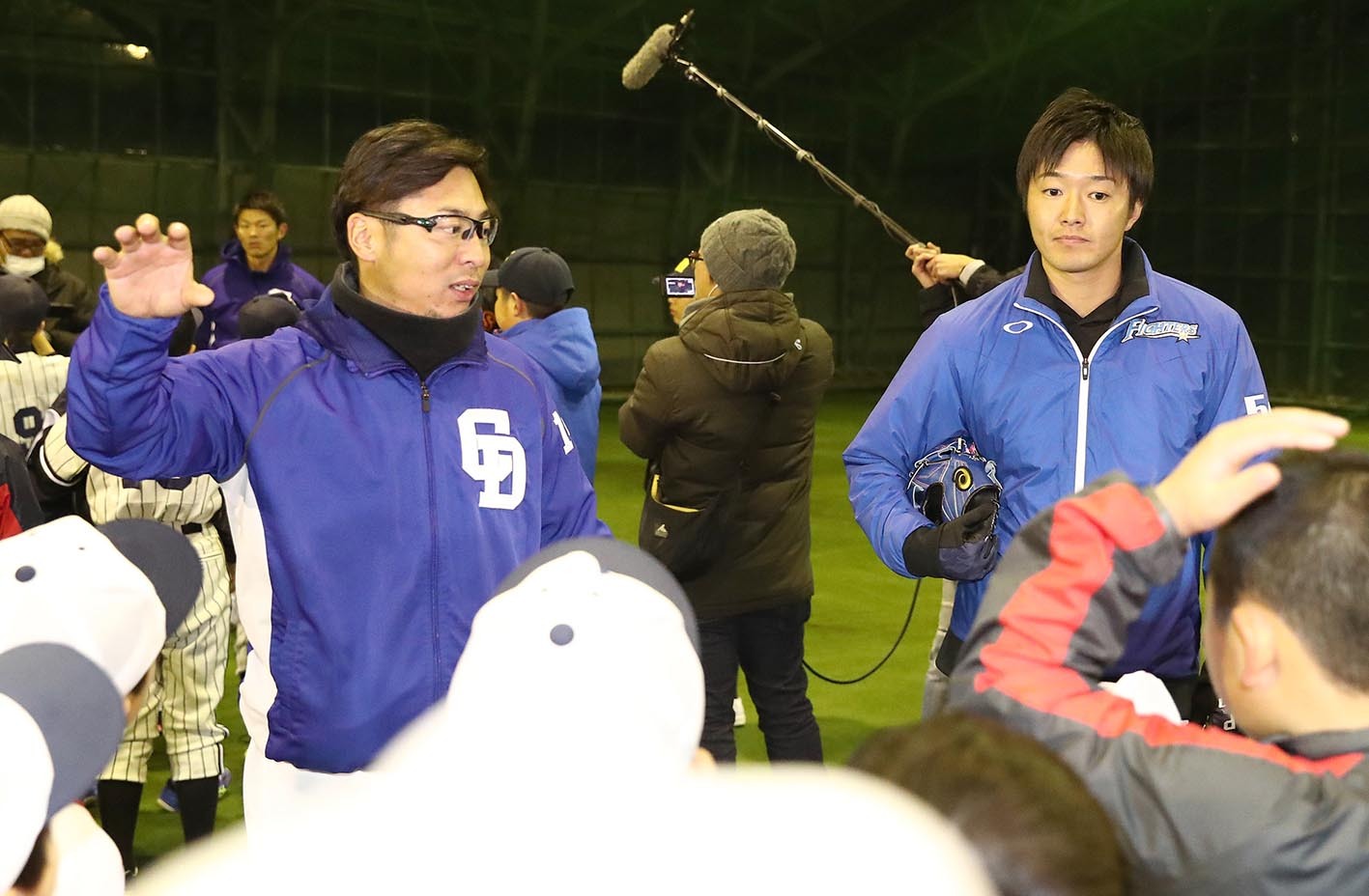 2018年12月17日、北海道胆振東部地震の被災地訪問で鵡川を訪れ、野球教室に参加した谷元(左)と玉井