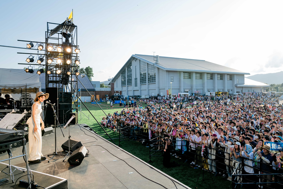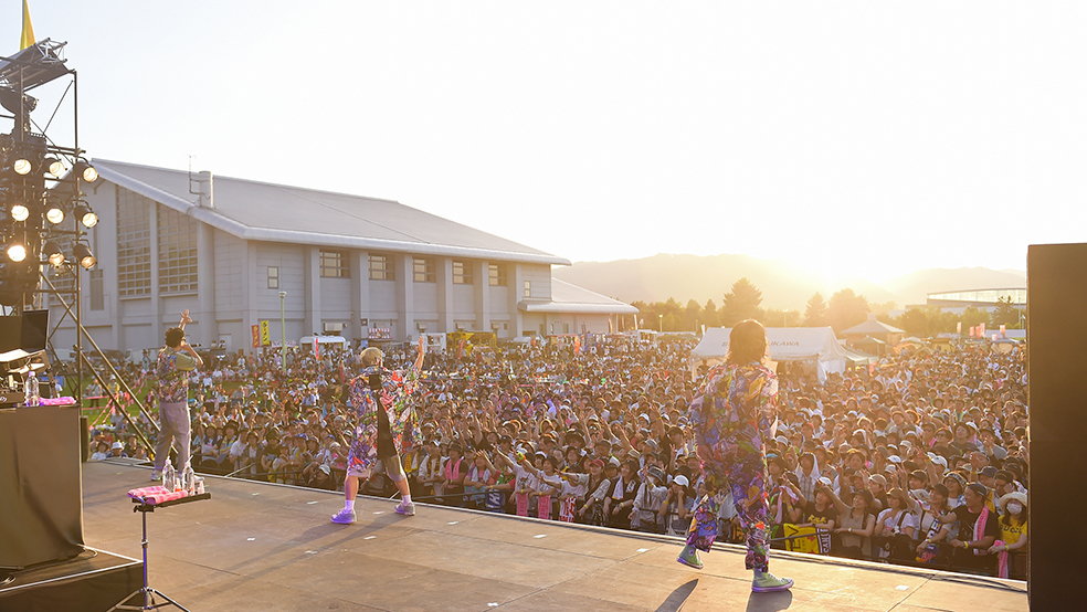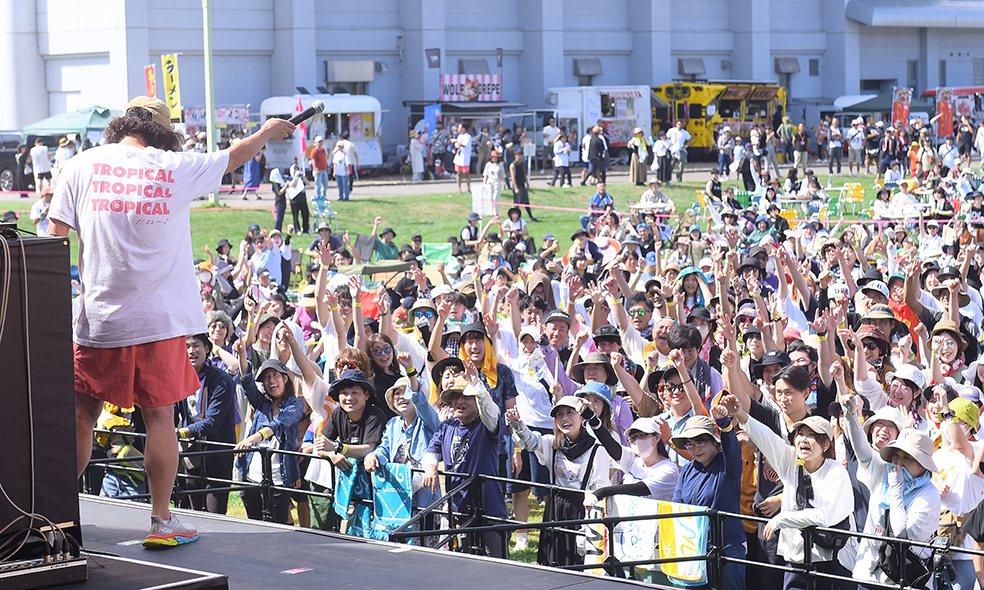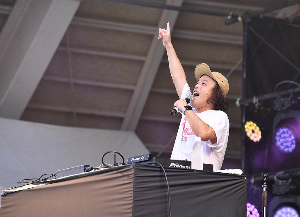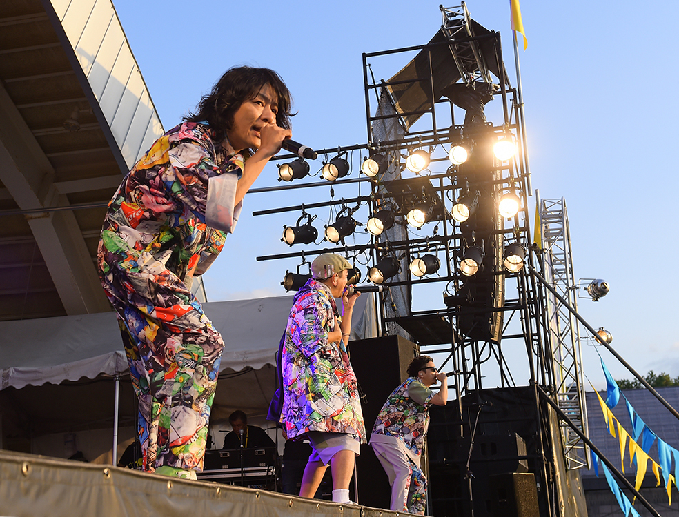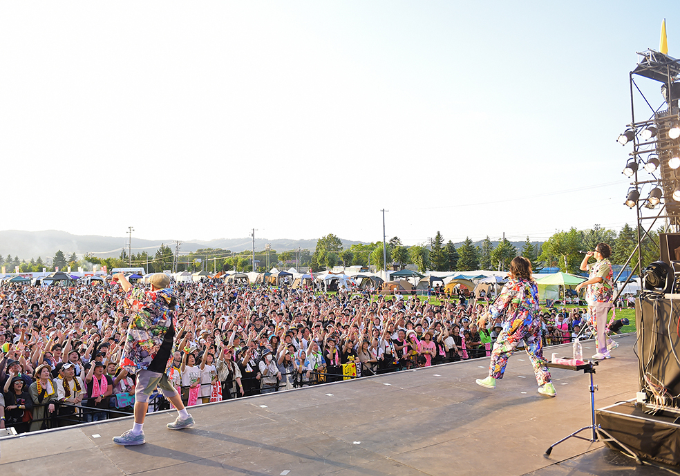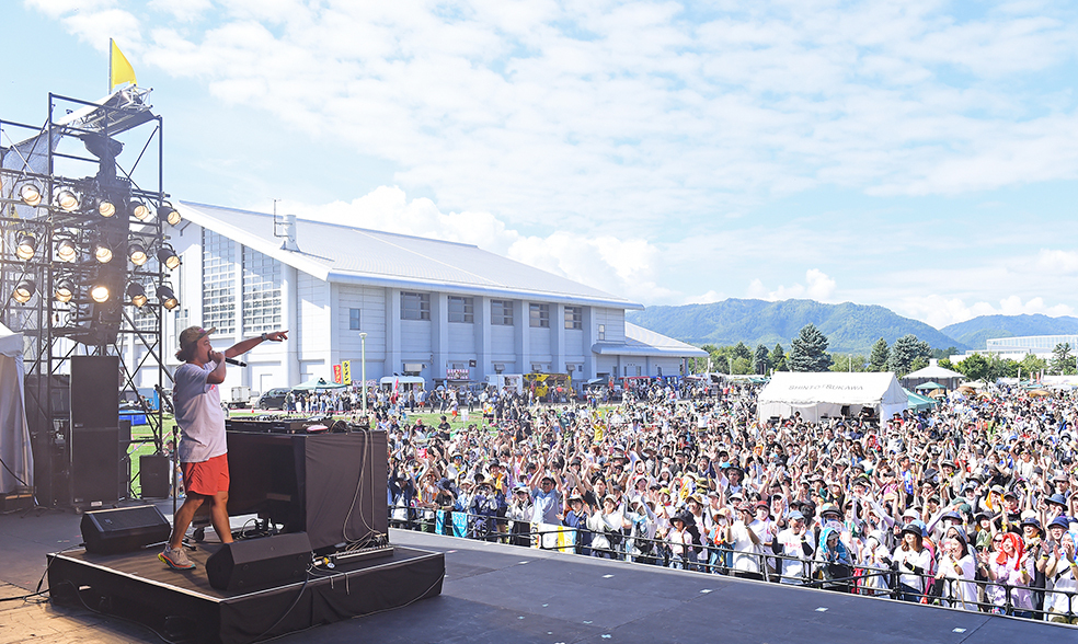 青空の広がった新十津川の会場が、非日常を体感する空間と化した。午前9時20分、地元の新十津川中と砂川中の吹奏楽部によるウェルカムステージで観客を出迎えた。そして、午前10時からはスカイステージが開演。トップバッターを飾ったのは、前身の「すながわ公園祭2019」から出演し続けているお笑い芸人のDJやついいちろうだ。機材トラブルで20分ほど時間が押すアクシデントはあったものの、水曜日のカンパネラの「エジソン」やB'zの「ultra soul」などを流し、「声の出せるフェスが戻ってきたぞー!」とスタートからオーディエンスをヒートアップさせた。