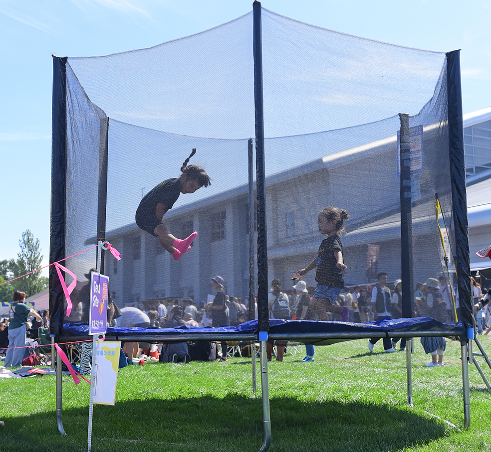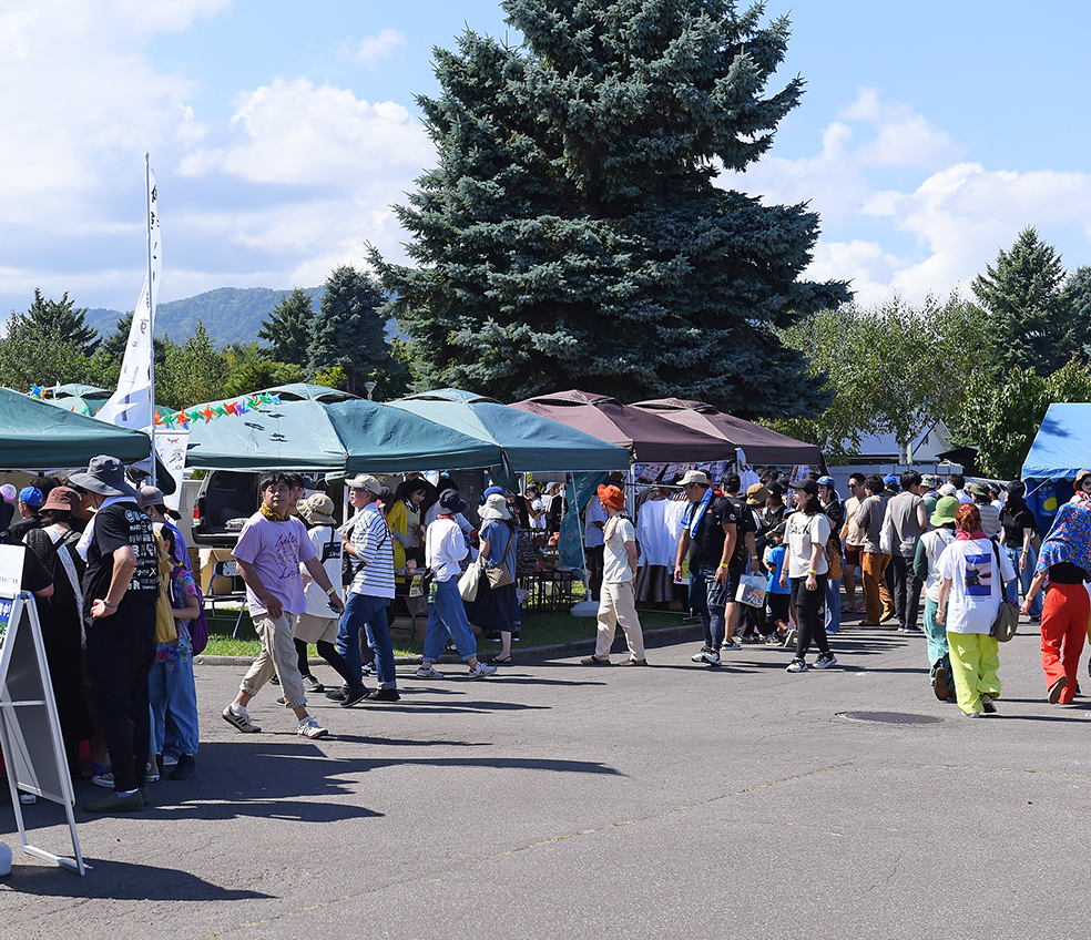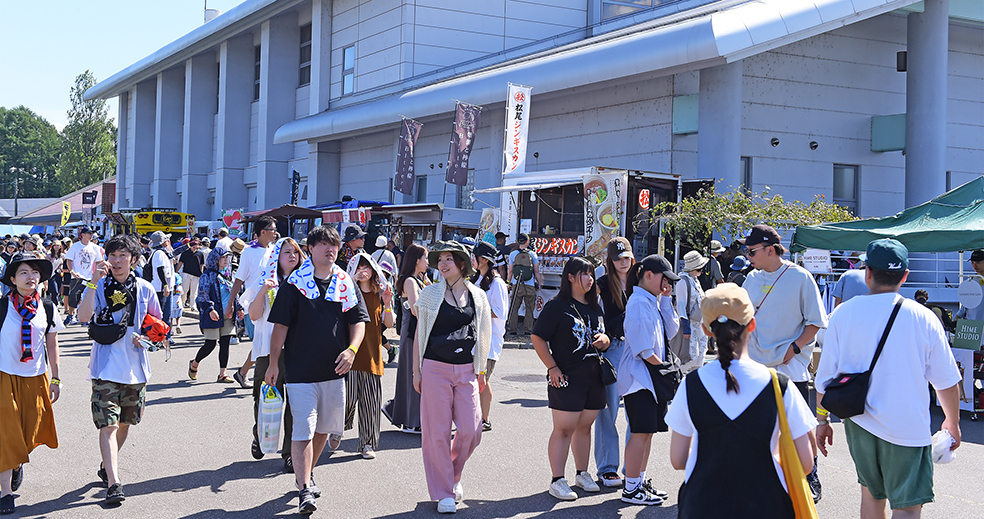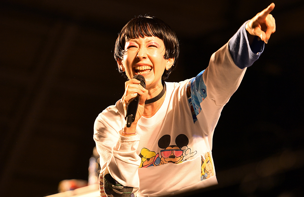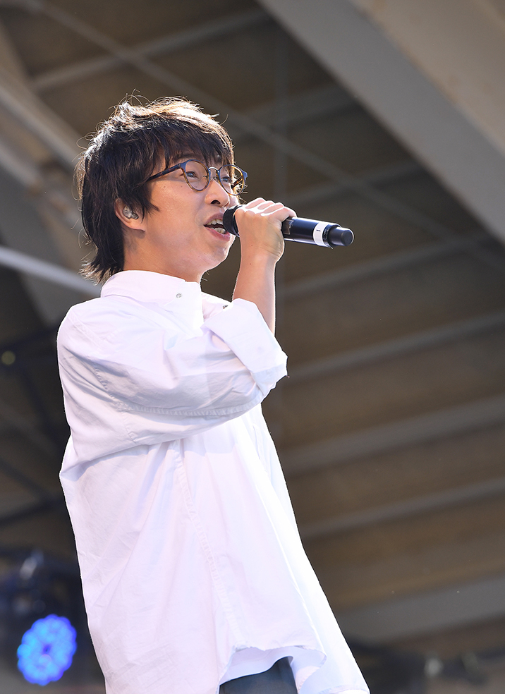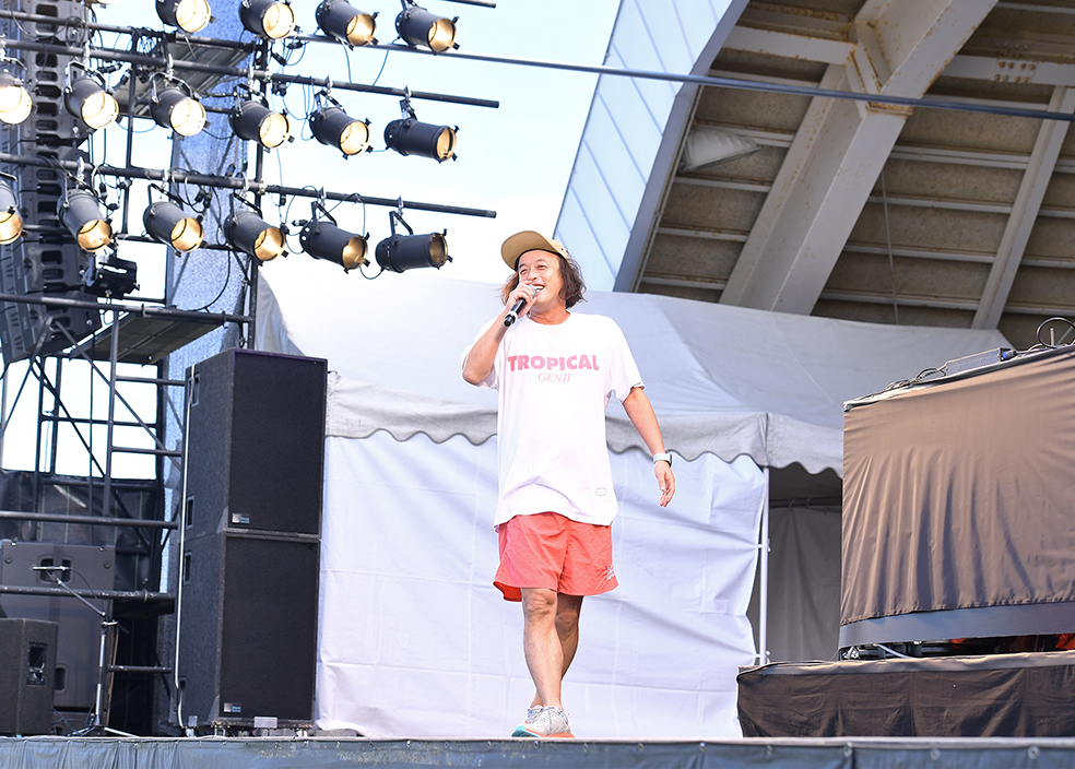 青空の広がった新十津川の会場が、非日常を体感する空間と化した。午前9時20分、地元の新十津川中と砂川中の吹奏楽部によるウェルカムステージで観客を出迎えた。そして、午前10時からはスカイステージが開演。トップバッターを飾ったのは、前身の「すながわ公園祭2019」から出演し続けているお笑い芸人のDJやついいちろうだ。機材トラブルで20分ほど時間が押すアクシデントはあったものの、水曜日のカンパネラの「エジソン」やB'zの「ultra soul」などを流し、「声の出せるフェスが戻ってきたぞー!」とスタートからオーディエンスをヒートアップさせた。