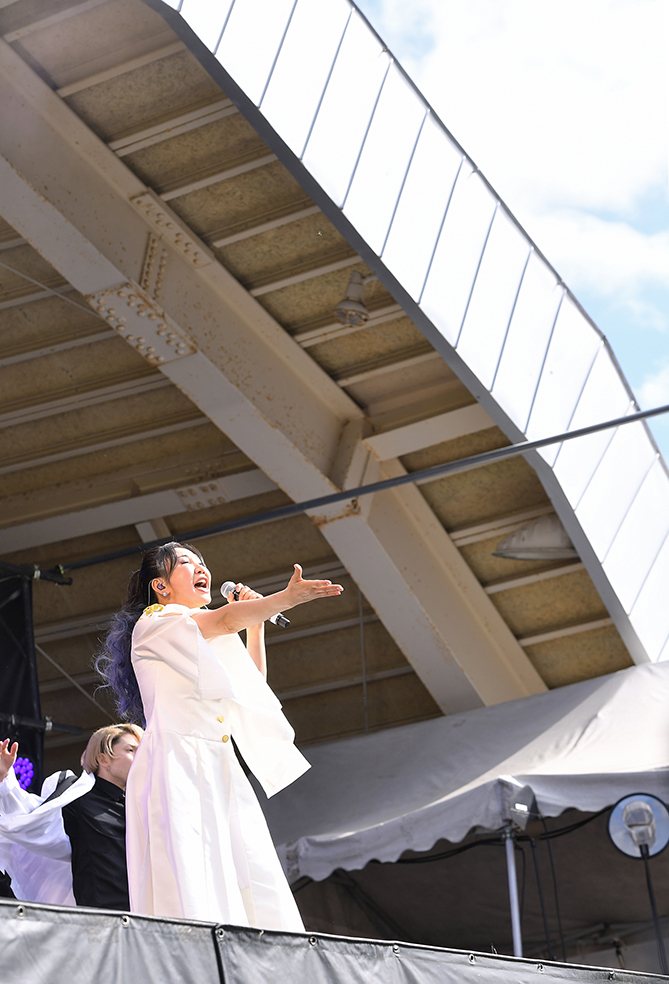 結成25周年を迎えたストレイテナーは「Melodic Storm」や、X(旧Twitter)の投票企画で選ばれたスピッツの「渚」、ゲストにmajikoを迎えての「冬の太陽」など、全8曲を披露。ボーカルのホリエアツシは「今年、北海道は3回目ですけど、北海道の空気は何回でも吸いたいです」と澄んだ空気を堪能した。昼過ぎまで及んだスカイステージの最後を飾ったのは、アニソンの女王・高橋洋子。「魂のルフラン」「残酷な天使のテーゼ」といった定番曲で会場を盛り上げた。