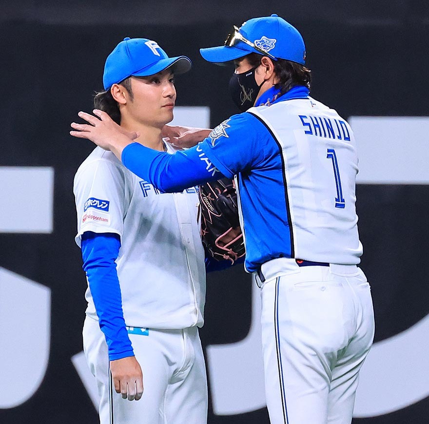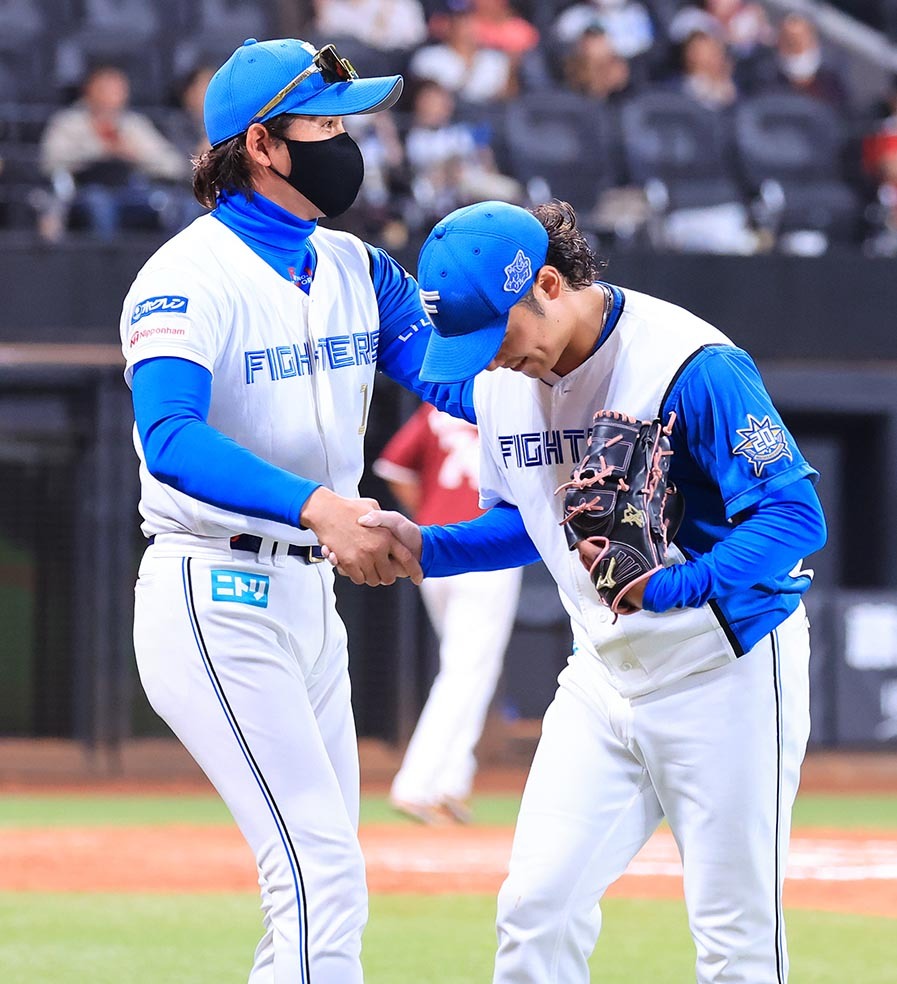先輩より長くマウンドに立ったが、1―1の九回に3点を失ったところで降板。ベンチ前で真っ先に出迎えた新庄監督から「お疲れ」とねぎらわれた。