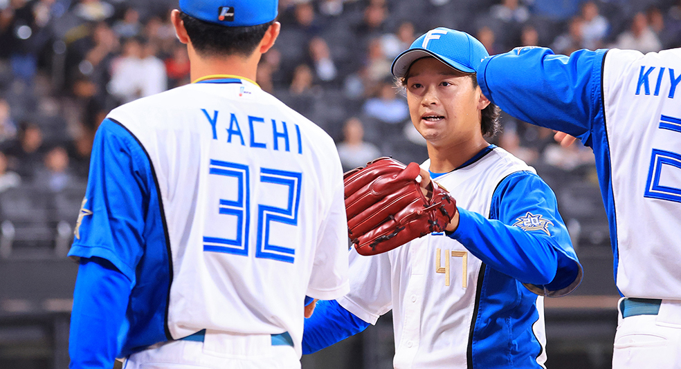 五回、谷内を迎えるために集まった日本ハム投手陣