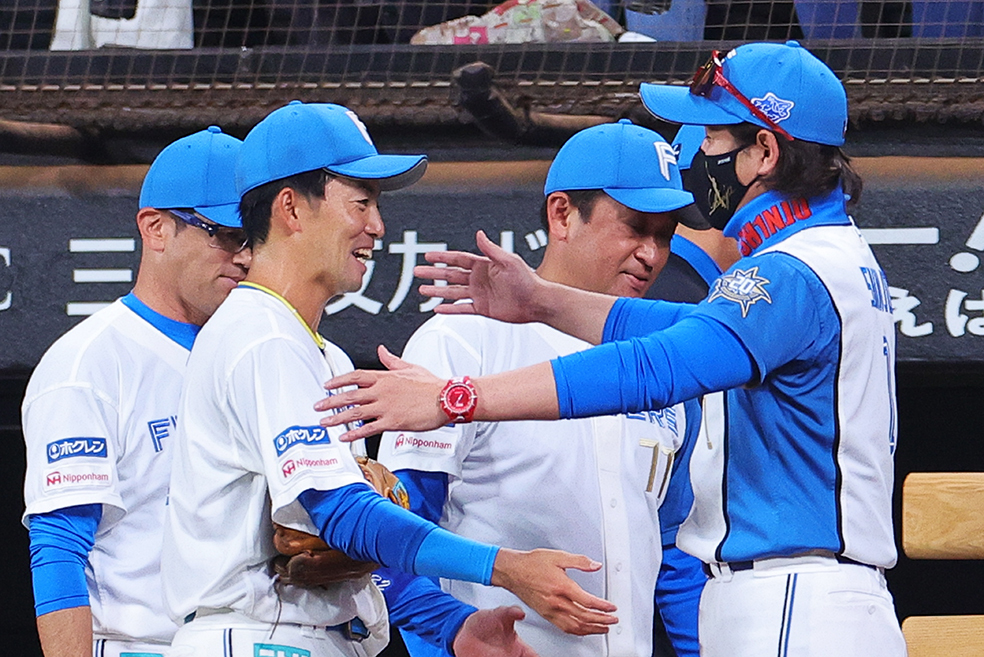 エスコンフィールドが一体となって、功労者を見送った。谷内はイニングごとにポジションを変え、最後は右翼へ。五回無死一塁で交代を告げられると、自身のファンが多く詰めかけたスタンドに何度も頭を下げた。ベンチ前で出迎えたチームメート一人一人と握手を交わし、最後は新庄監督と抱擁。11年間のプロ野球選手生活に別れを告げた。