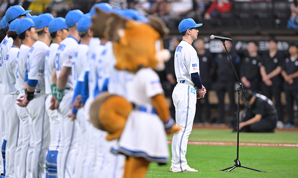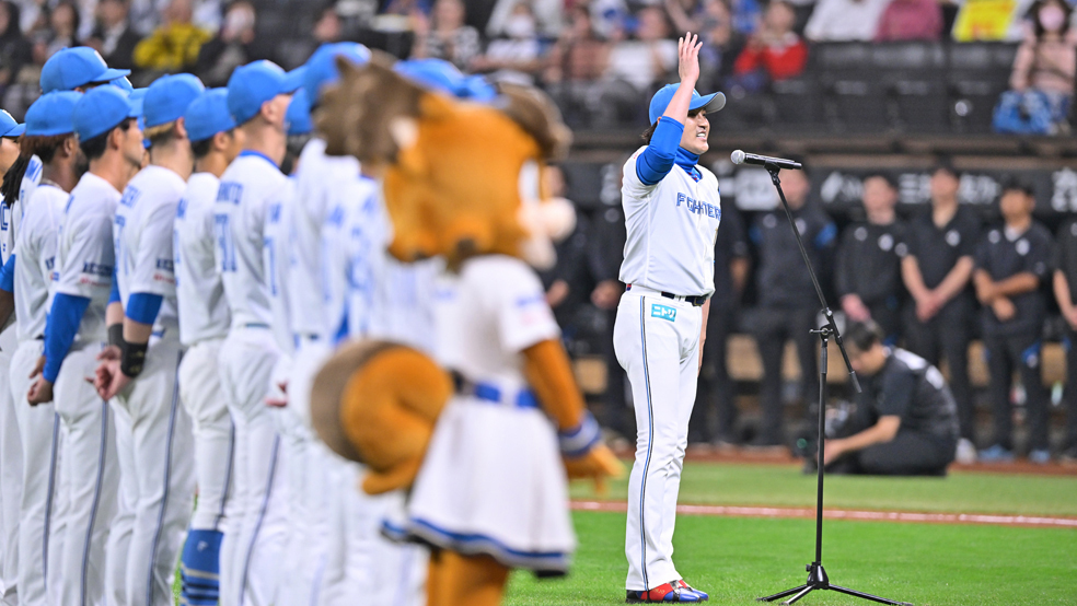 「今年はここエスコンフィールドで開幕した記念すべきシーズンでした。この素晴らしい球場でプレーできることに感謝し、常に勝つことだけを考えて、きょうここまで戦ってきました。結果は悔しいものになってしまいましたが、ファイターズは日々成長しています。若い選手が多いですが、今年の経験を生かし、選手全員で強いファイターズをつくっていきたいと思います。コロナ禍で約2年間、聞くことができなかったファンの皆さまの生の声援は、選手一人一人に大きな力をくれました。来季はここエスコンフィールドが常に満員になるような、そんな試合をお見せしたいと思っています。ここにいる選手はもちろん、ファンの皆さま、そして北海道が一丸となり、新庄剛志監督を日本一の監督にしましょう。最後になりますが、この1年間、温かいご声援、本当にありがとうございました」