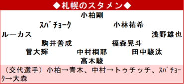 4-4-2でコンパクトに守ってくる柏に対し、札幌はボールをつなぎながらチャンスをつくっていくが、ペナルティーエリア外からのミドルシュートは精度が足りなかった。柏は札幌に中央へのくさびパスを入れないよう、元札幌MF高嶺とMF椎橋のダブルボランチが鍵を掛ける。札幌は高いDFラインの裏や、サイドチェンジからの攻撃で好機をつくるも得点にはつながらなかった。