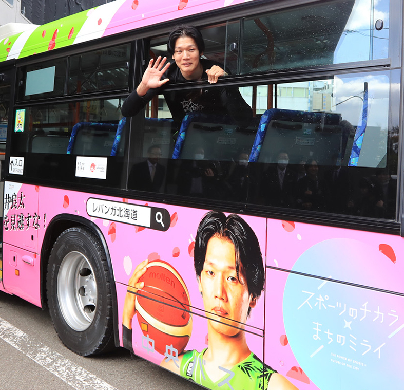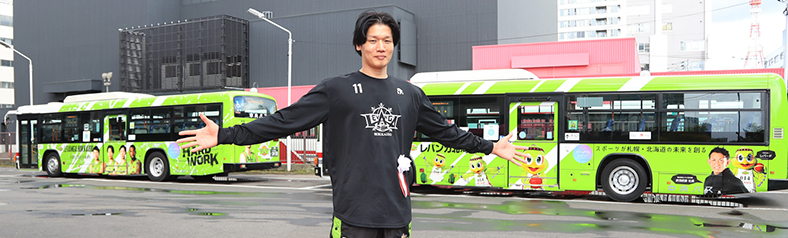 2016年には北海道コンサドーレ札幌、北海道日本ハムファイターズとともにプロ3チームのコラボで札幌市営地下鉄ジャックを行ったことはあるが、ラッピングバスは初めての試み。3台のバスは平岡営業所に所属し、本拠地である札幌・北海きたえーるの最寄りの停留所にも止まる計画。「この話が耳に入ったときに、地元の友達や家族に少し自慢しました(笑)。みんなが、ぜひそのバスに乗って会場に行ってみたいという話を頂いた。北海道にいるブースターの方だけではなく、本州にいるブースターは北海道に来て、試合はもちろんだけど、このバスに乗って会場に行くという別の楽しみ方もあると思う」と期待した。