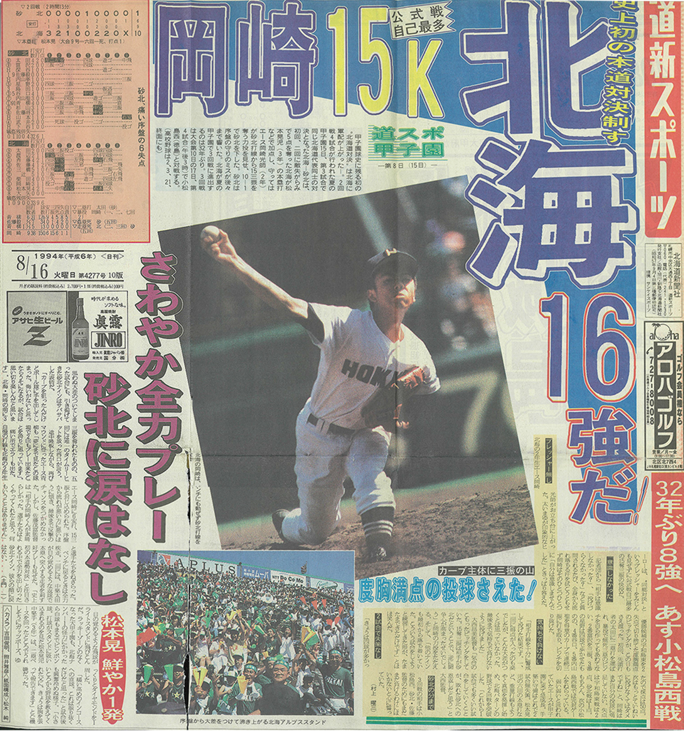 2年生で挑んだ初めての甲子園。1回戦で優勝候補の一角・宇和島東(愛媛)を6-2で破ると、2回戦で史上初の砂川北との北海道対決を10-1で制し、さらに3回戦で小松島西(徳島)に14-5と強力打線をバックに次々と勝ち上がった。「まっすぐとカーブ。フォークは投げなかった。結構打たれましたね。暑かったし、緊張しました」。今年のチームと違い、3試合とも岡崎が完投勝利。フル回転で同校32年ぶりの8強入りをけん引した。