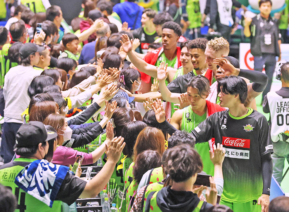 試合終了後、開幕戦に集まったブースターとハイタッチして回る選手たち