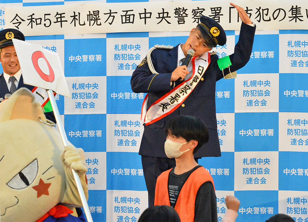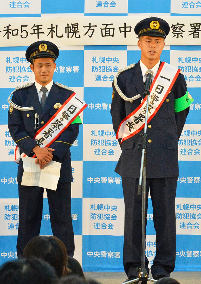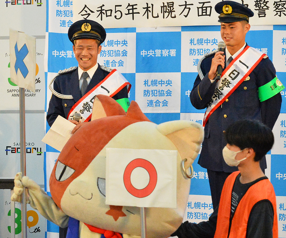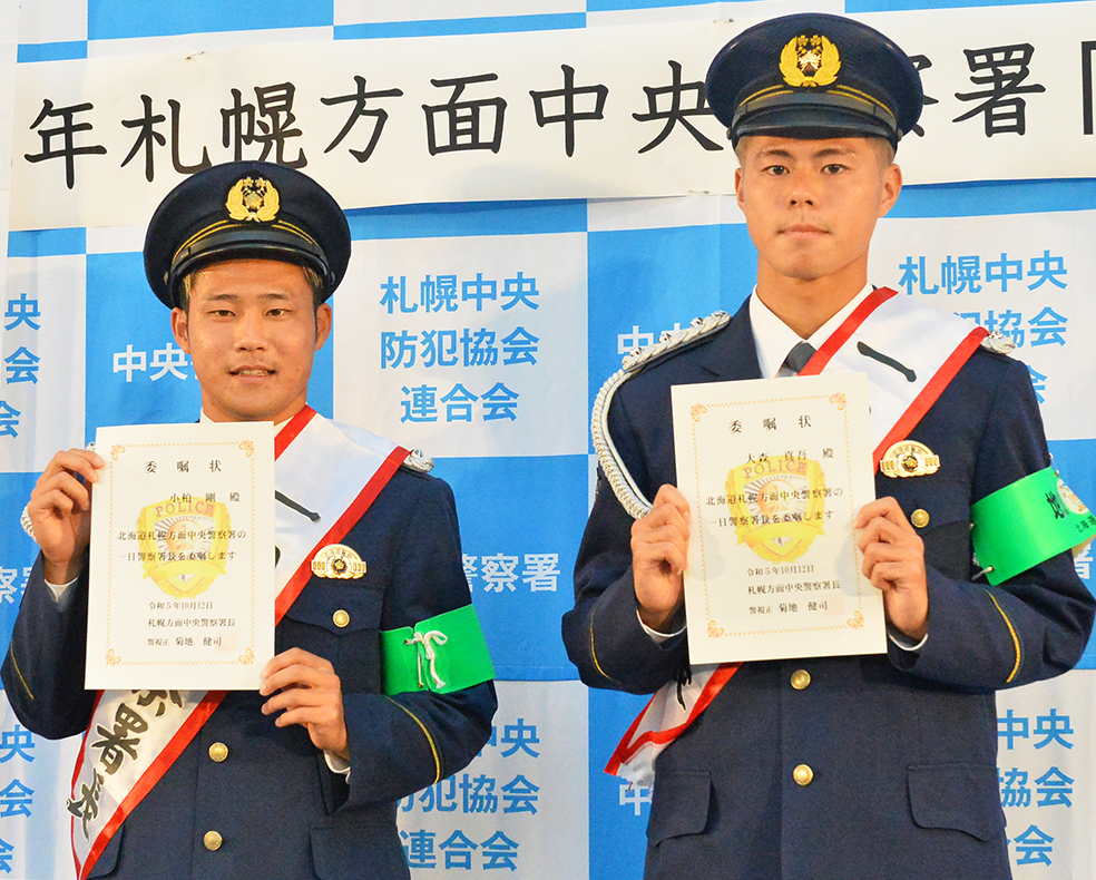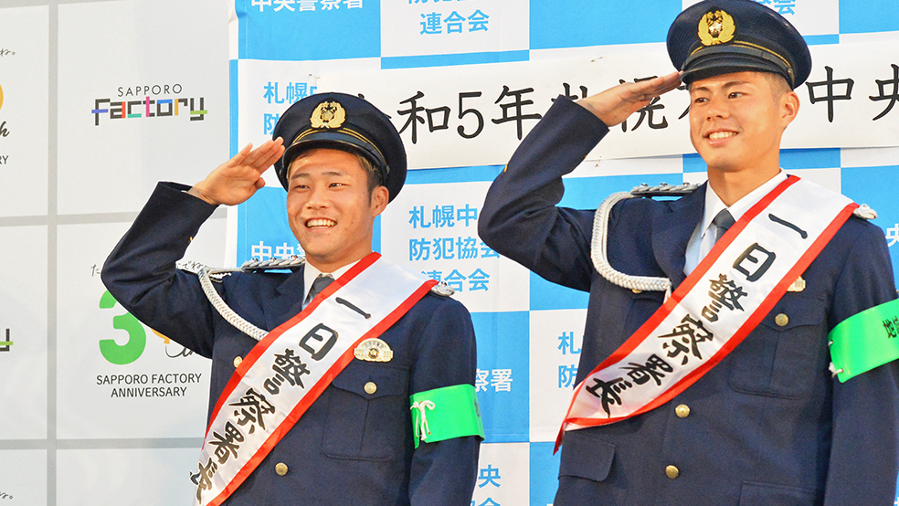 北海道コンサドーレ札幌のFW小柏剛(25)とFW大森真吾(22)が12日、北海道警札幌方面中央警察署の一日警察署長としてサッポロファクトリーで行われた「防犯の集い」イベントに出席した。