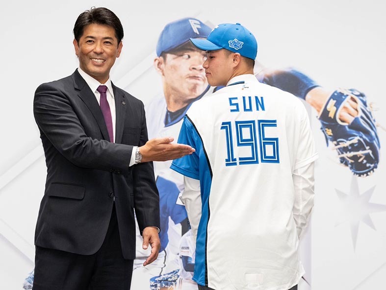 「孫投手のことは、彼が高校2年生の時から、ファイターズの国際スカウトが注目をしておりました。私も実際に今年9月のUー18の大会で初めて見ました。今年の春から投手として急激に力をつけてきているという報告を受けていましたが、実際に見てすごいストレートを投げていましたし、マウンド度胸もあり、本当に素晴らしいピッチャーだと思いました。北海道日本ハムファイターズは、これまで海外のアマチュア選手と契約をしたことはありません。これは、我々にとって歴史的な出来事であり、孫投手はその歴史の1ページに相応しい投手と思っています。今回お集りいただいた大勢のメディアの皆様をみても分かる通り、孫投手は台湾の宝です。大切にしっかりと育て、将来的に世界で戦えるようなピッチャーになると期待しています」