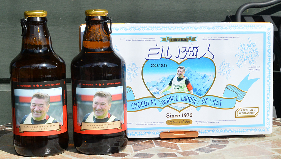 一つは石屋製菓が販売するおなじみの『白い恋人』。練習場に隣接する白い恋人パーク内で実施しているオリジナルデザイン缶作成サービスを利用して、監督のオリジナル缶を作成した。