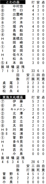 とわの森も四回表、1番・中村悠飛遊撃手(2年)の中越え二塁打、2番・竹口朝陽中堅手(2年)の右前打で無死一、三塁とし、3番・出雲崎紘捕手(2年)の中前適時打ですぐさま反撃、相手のバッテリーエラーでさらに1点を追加した。しかし、その後は東海大札幌高の継投策の前に追加点を奪えなかった。