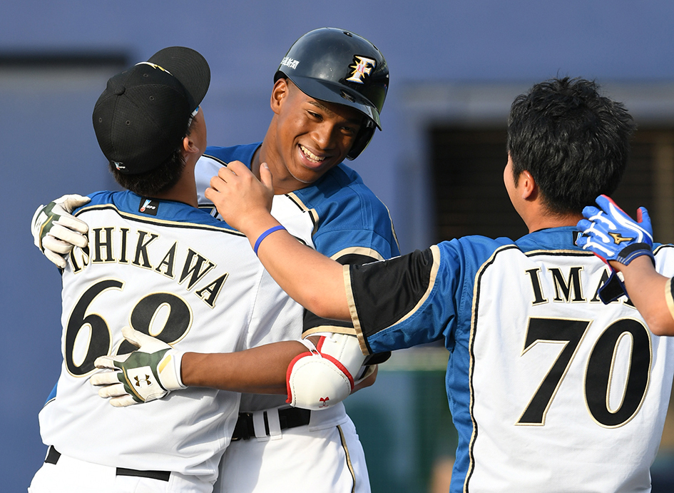 2019年5月10日のイースタン・リーグ楽天戦。延長十回裏、万波(中央)がサヨナラ逆転3ランを放ち、チームメートと喜ぶ