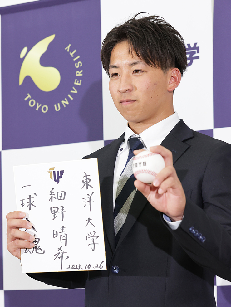 ■プロフィール 細野 晴希(ほその・はるき)2002年2月26日、東京都生まれ。左投げ左打ち。小学2年で野球を始め、東亜学園高(東京)を経て東洋大に進学。今春リーグ戦で好投を続け、チームを1部復帰に導いた。今夏の高校日本代表vs大学日本代表ではアマ球界の左腕として最速の158キロをマークした。持ち球はスライダー、カットボール、ツーシーム、スプリット、チェンジアップ。180センチ、86キロ。