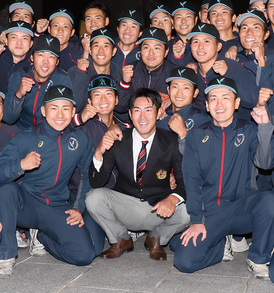 日本ハムからドラフト3位で指名された山梨学院大の宮崎(中央上)(山梨学院大提供)