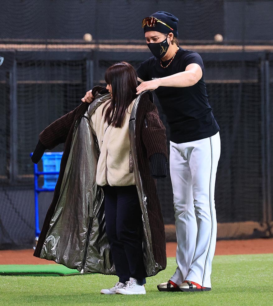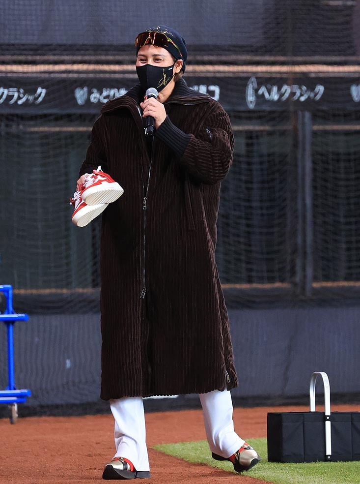 ファンにプレゼントする自前のコートを着て登場した新庄監督