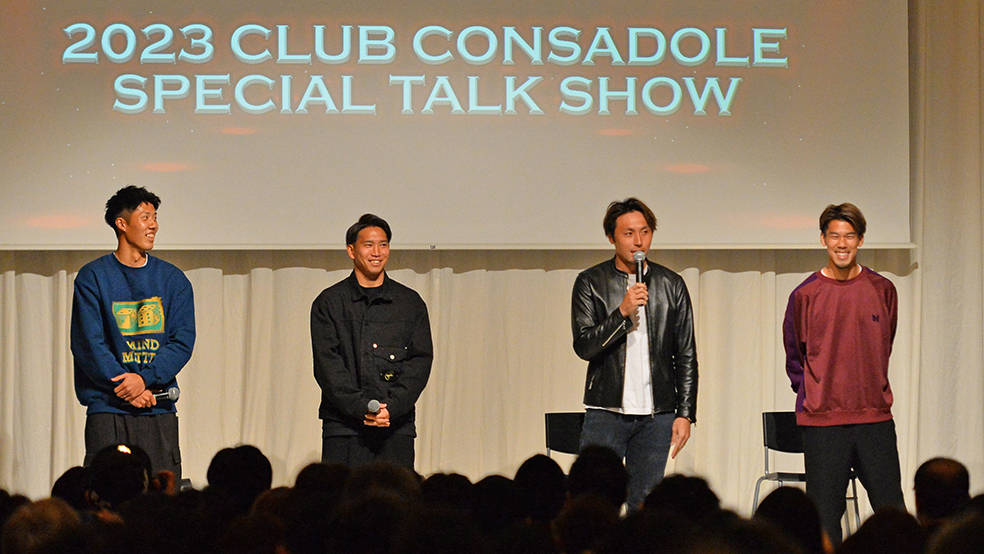 北海道コンサドーレ札幌は18日、札幌市内でファンクラブ会員を対象とした『2023クラコン スペシャルトークショー』を開催。DF田中駿汰(26)、MF浅野雄也(26)、GK松原修平(31)、GK高木駿(34)の4選手がトークやゲームなどで、来場した約200人の札幌サポーターと約1時間半にわたり交流した。