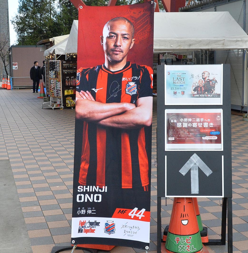 今季限りで引退する北海道コンサドーレ札幌MF小野伸二(44)の現役ラストゲームとなる12月3日浦和戦(札幌ドーム、14時キックオフ)。その試合でピッチ上に広げられるセンターサークルバナーへの寄せ書きが19日にさっぽろテレビ塔で行われた。テレビ塔は2014年6月9日に小野の札幌加入会見が行われた記念すべき場所。〝始まりの地〟に駆けつけたファンはそれぞれの思いを小野の姿が描かれたバナーに書き込んでいた。
