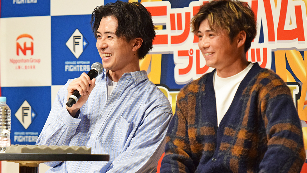 プレミアムトークライブで笑顔を見せる上沢(左)と上川畑=撮影・宮西雄太郎