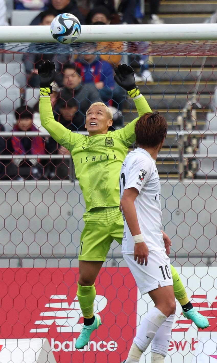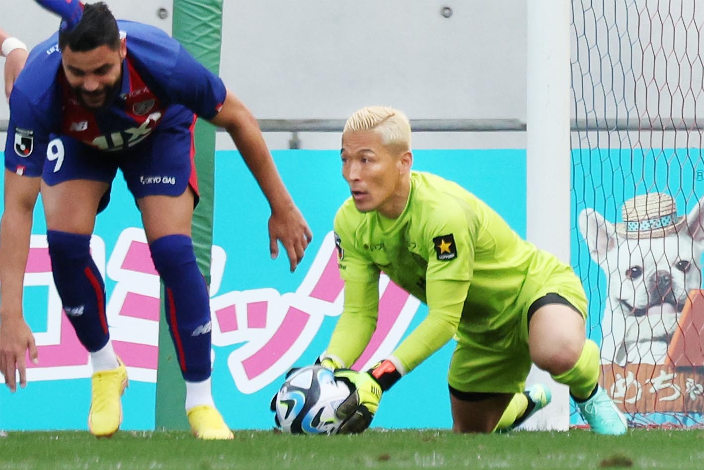久しぶりの公式戦を全く感じさせないプレーを披露し続けた。試合開始早々の前半4分、自陣での連係ミスをきっかけにピンチを招き、MF原川力(30)との1対1の局面をつくられてしまうが、右手1本でシュートを防ぐ。後半45分にもFW仲川輝人(31)に裏を抜けられ再び1対1の場面をつくられるが、今度は左足1本でシュートをブロックした。「練習通りですかね。そこはGKコーチの赤池さんに感謝したいと思います」と、日々指導を受けている赤池保幸コーチ(49)をたたえた。