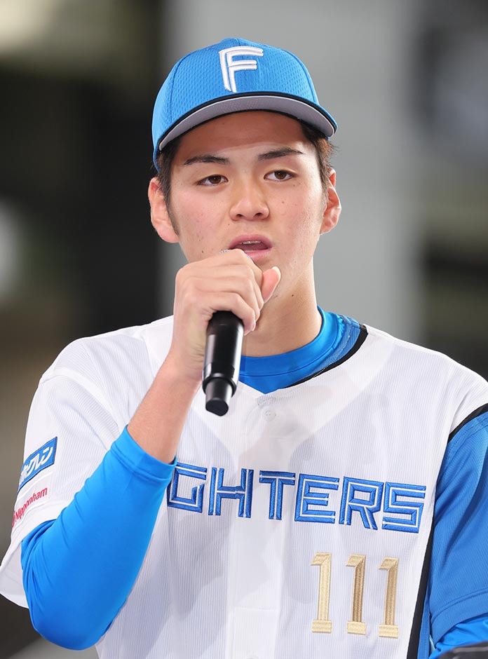 「友達と話していて全部1だったら良いなと思っていたので、まさか111番をもらえると思っていなかったのでうれしく思います。まずは支配下登録されて1軍に出て、新庄監督のようなプレースタイルを目指して、いつかは背番号1番を付けたいと思います」