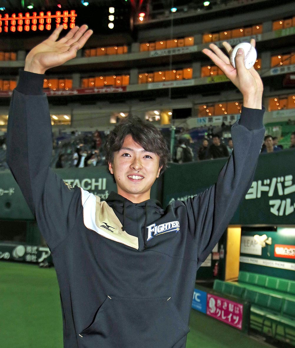 2014年4月2日のソフトバンク戦でプロ初勝利を挙げ、ウイニングボールを持ってファンの声援に応える上沢