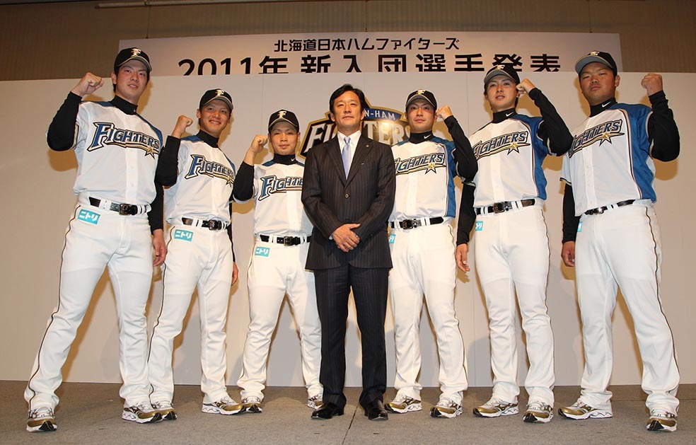 2011年の新入団選手。栗山新監督を中心に(左から)2位・松本剛、3位・石川慎吾、4位・近藤健介、5位・森内寿春、6位・上沢直之、7位・大嶋匠