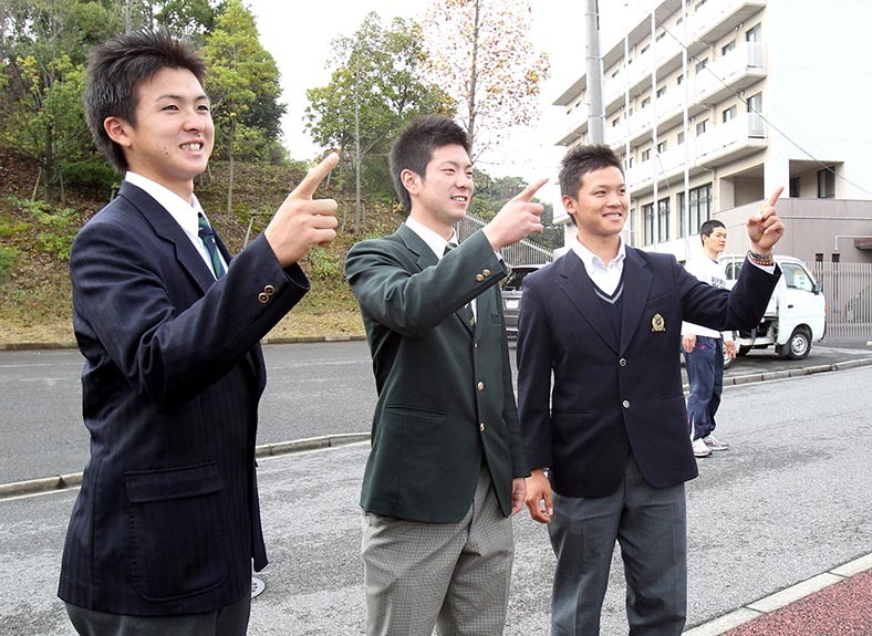 2011年11月、鎌ケ谷の球場や施設を見学した(左から)上沢、松本剛、石川