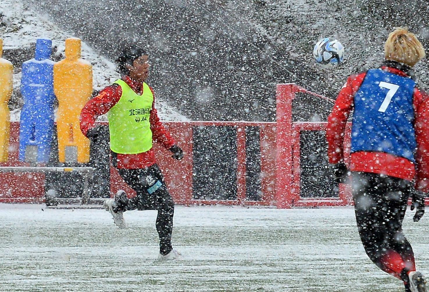 激しい雪の中でプレーするMF田中宏(左)