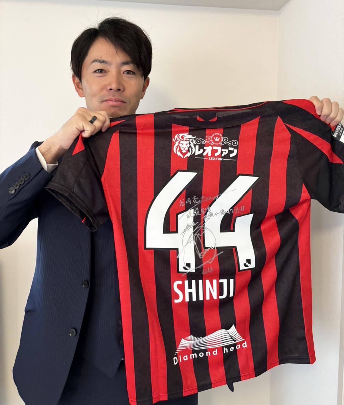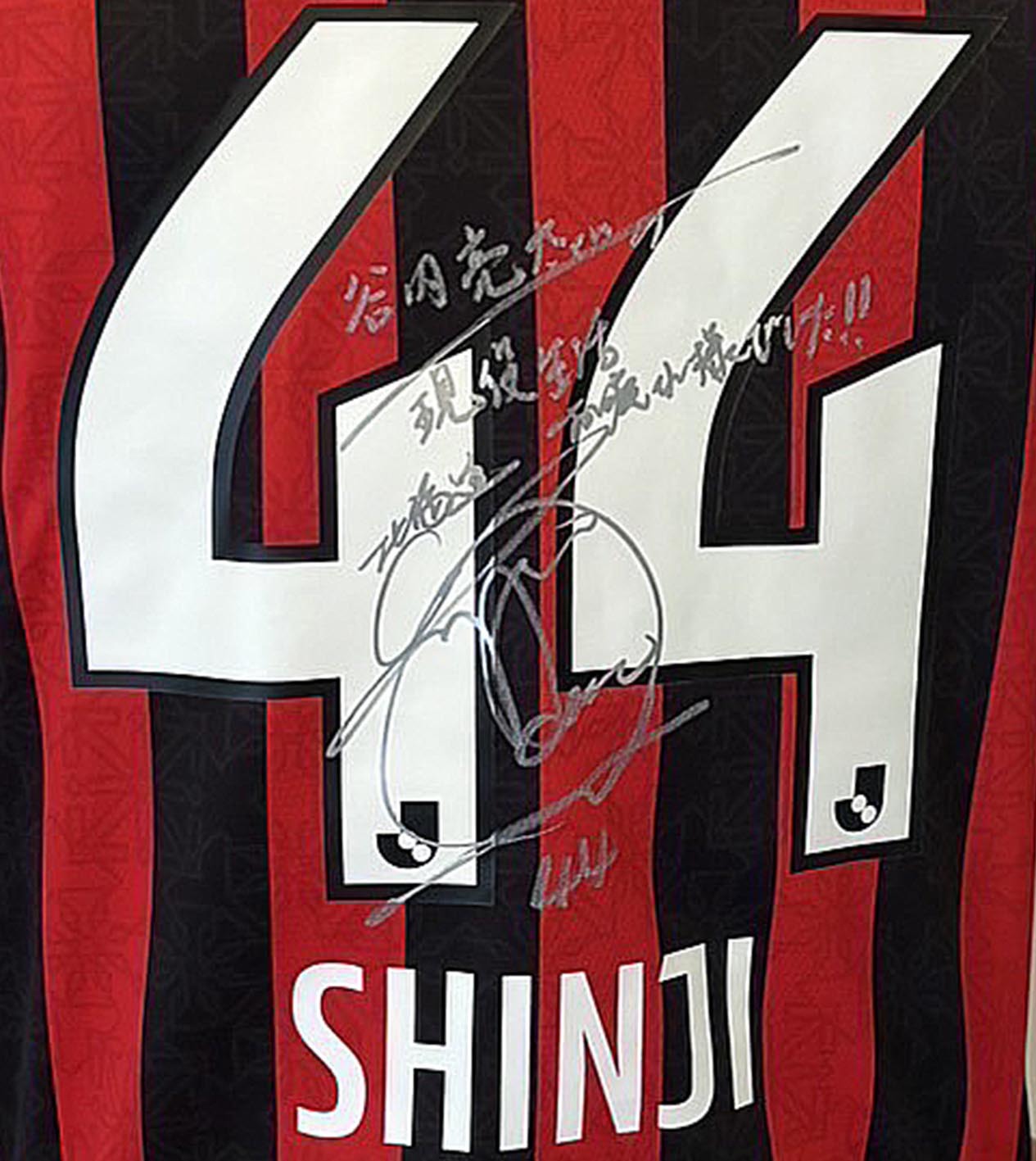 小野伸二から贈られたサイン入りユニホームを手に笑顔の谷内(本人提供)