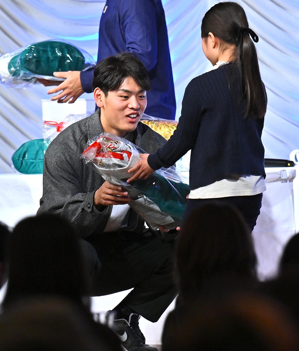 会場に来ていた子どもたちにクリスマスプレゼントを渡す野村