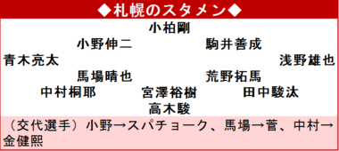 最後まで小野は魅せるプレーで札幌ドームに集まった3万1143人の観衆を沸かせた。まずは前半4分、後方から来たMF宮澤裕樹(34)からのロングボールをワンタッチで前方のMF駒井善成(31)にパス。相手DFのプレッシャーでボールを収めることはできなかったが、あいさつ代わりのエンジェルパスで一気に会場のボルテージを上げた。次は同10分。左サイドのペナルティーエリア付近でくさびのパスを受けたFW小柏剛(25)からマイナスのボールを落とされると、全ての状況を把握しているかのようなワンタッチパスで右から走り込んだ逆サイドのDF田中駿汰(26)にクロスを合わせた。ここもあとちょっとのところで絶好機につなげられず、ボールは惜しくも外へ流れた。