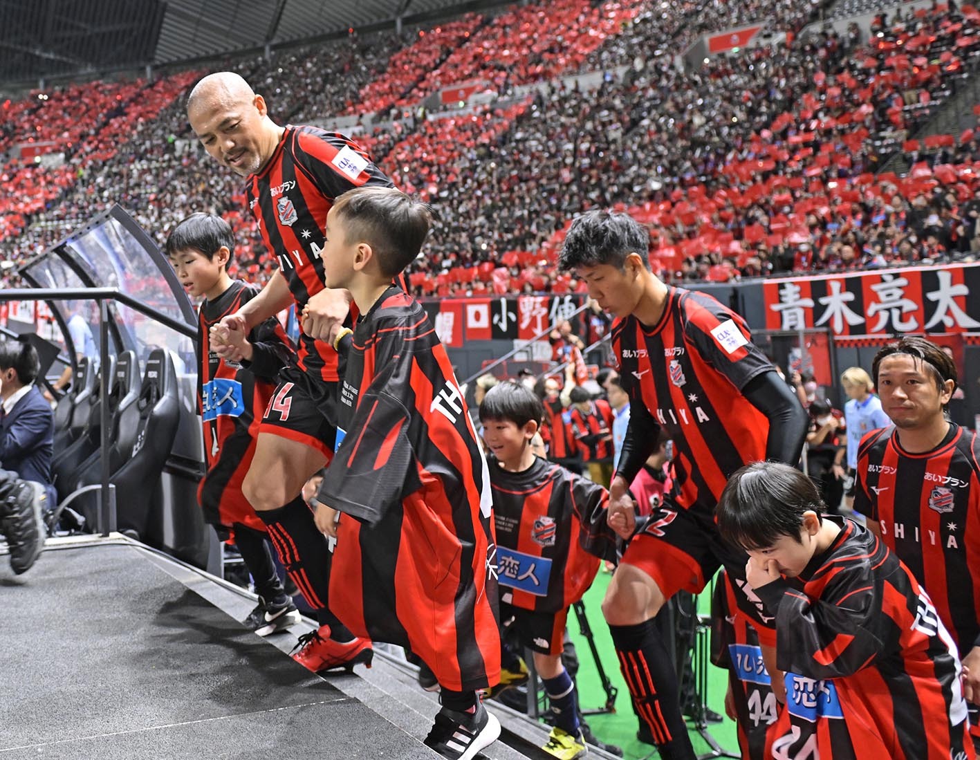 相手のオフサイドでプレーが止まった同20分、ついに交代が告げられた。するとピッチにいる両クラブの選手全員が中央に集り、小野のために花道をつくった。小野は一人一人にハイタッチや抱擁で応え、ピッチの外へ一歩踏み出でると振り返って一礼。会場全体から大きな拍手と大声援を浴びた。現役最後のプレーを終えた小野は両手を振って応え、ピッチサイドで待ち構えた両クラブの控え選手、監督、スタッフの出迎えを受けた。そして札幌の一人一人とも握手や抱擁を交わし、同22分にようやくベンチに腰を落ち着けてスパイクの紐を緩めた。