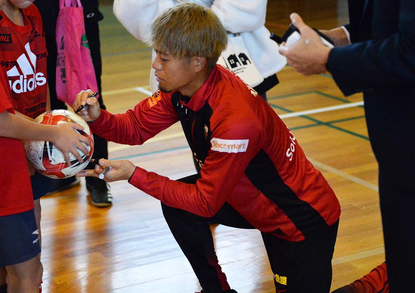 ボールにサインをするMF駒井