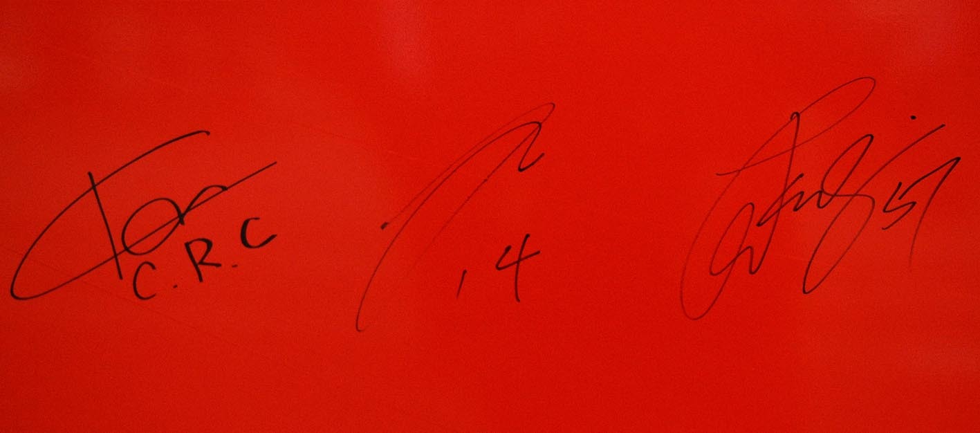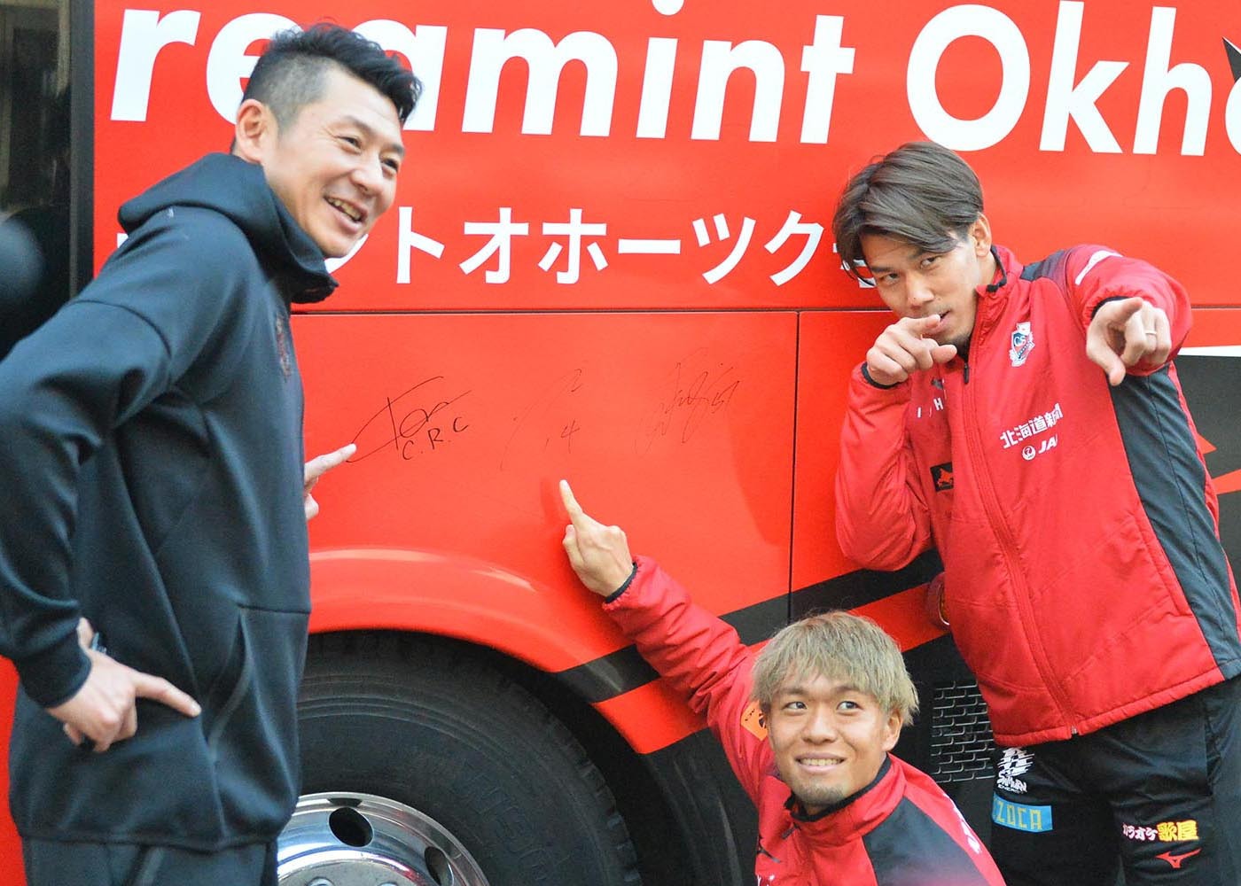 ツアーバスの車体にサインをした(左から)河合CRC、MF駒井、GK高木(撮影・工藤友揮)