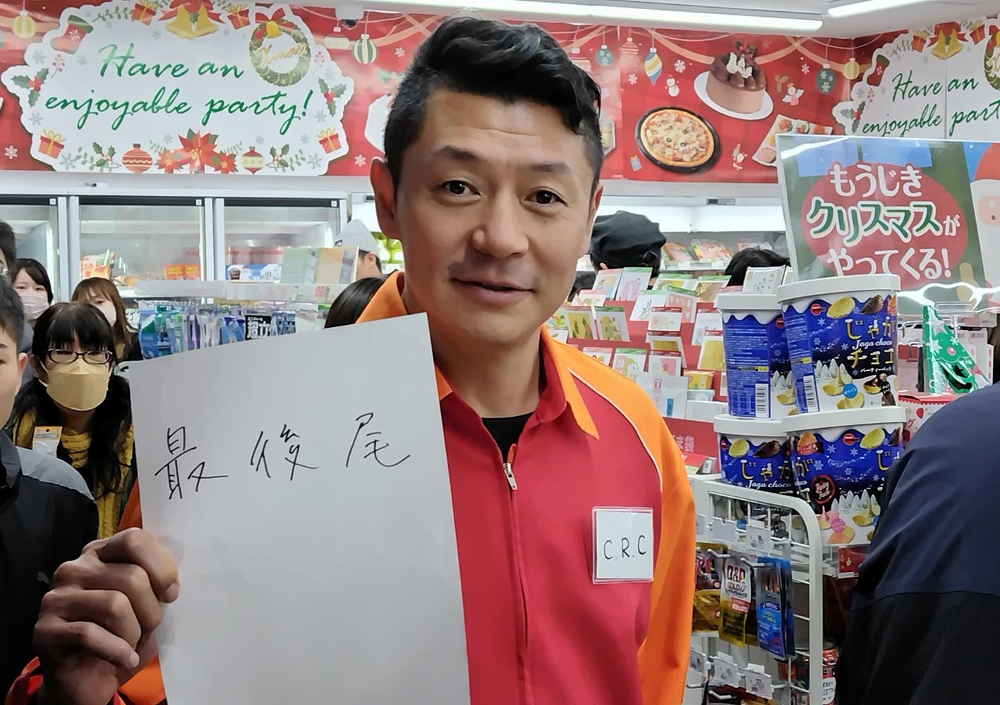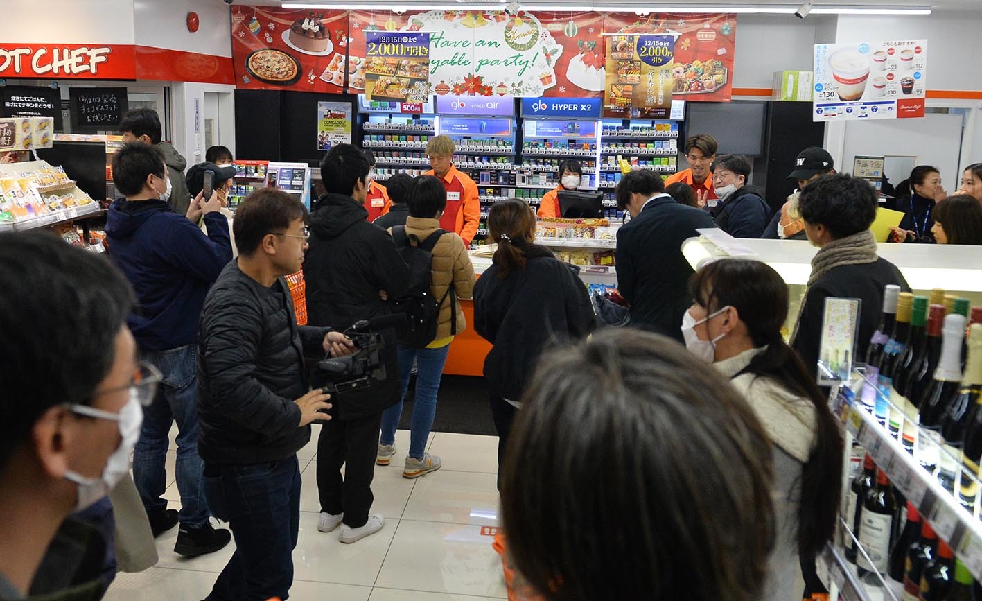 広い駐車場は来店者の車でいっぱいとなり、店内は大混雑。(株)セイコーマートの古田千香さんはその光景に「こんなにいらっしゃるんだなと思って。すごい勢いでお客さまが並んでいました」と驚きの表情。選手2人の働きぶりを「すばらしいですね」と語った。「一番働きぶりがすばらしい」と高評価を得たのは最後尾の誘導を買って出た河合CRCだった。「うちのオペレーションマニュアルのようでびっくりしながら見てました。すごいと思います」。河合CRCも笑顔を見せていた。