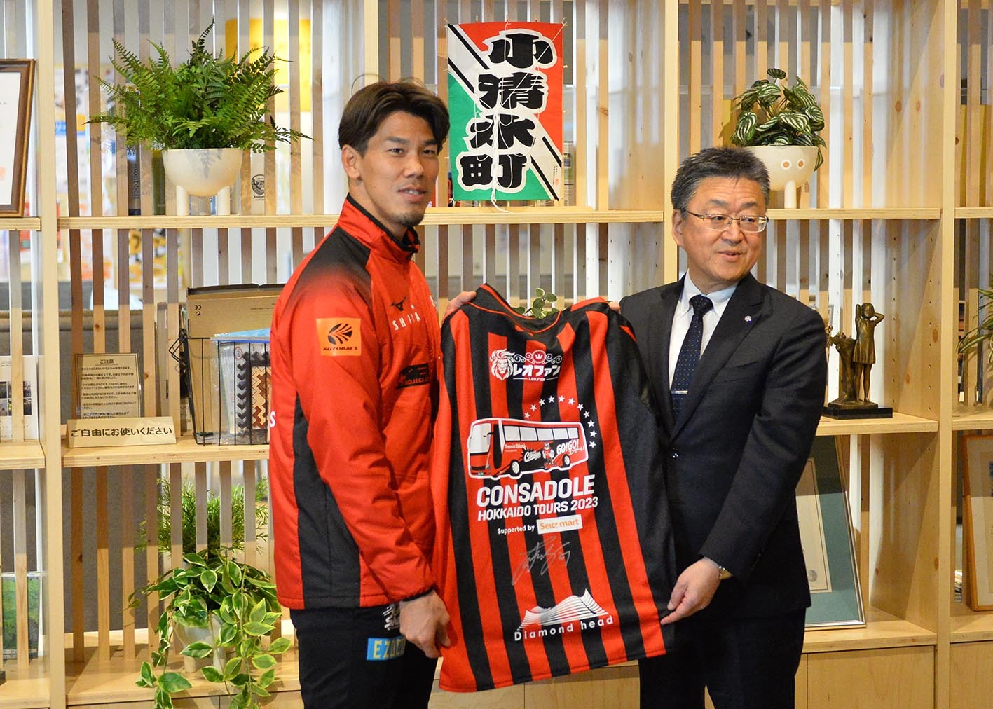 小清水町長に記念のユニホームを贈呈するGK高木(左)=撮影・工藤友揮