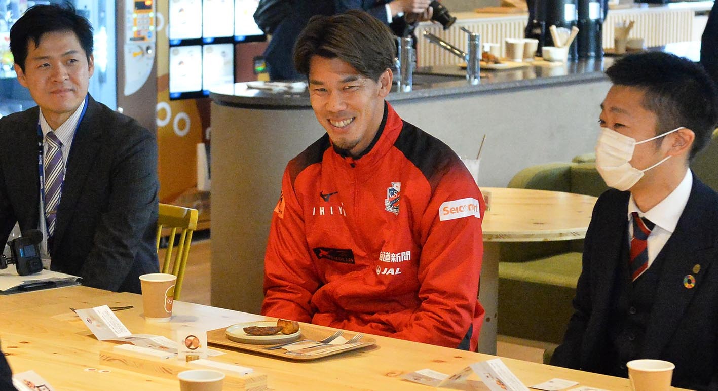 前日同行していたMF駒井善成(31)が他のイベントへ参加するため別行動となったツアー2日目。この日は河合竜二CRC(45)と共に小清水町を訪問する予定だったが、河合CRCが発熱による体調不良で参加を中止し、急きょ高木一人で巡ることとなった。高木は緊急事態にも動じることなく、小清水町長との懇談にしっかり対応。2日連続となったセイコーマートの一日店長も、前日の反省を踏まえて気持ちに余裕を持って取り組み、約1時間の業務を無事に終えた。