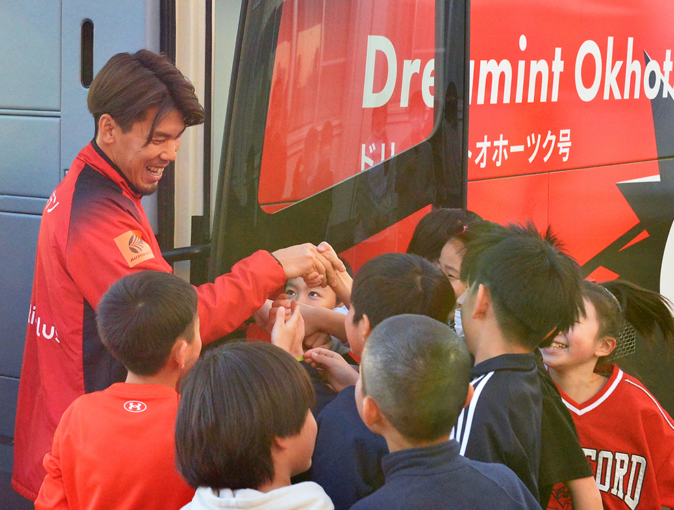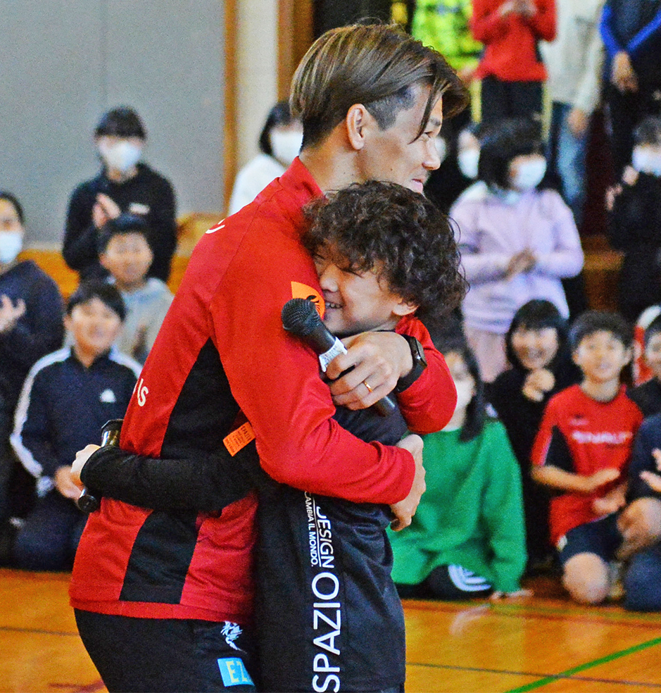 全員での記念撮影後、サッカー少年団に所属している児童からお礼の言葉をもらった高木。その児童が周囲から握手してもらうよう促される中、高木が自らその児童に抱きつき、熱い抱擁を交わしてサッカー少年へエールを送った。最後は児童たちに花道をつくってもらい、ハイタッチしながら体育館を退場。児童たちはプロサッカー選手との別れを惜しみ、校舎の外まで出てバスの発車間際まで高木との触れ合いを楽しんだ。